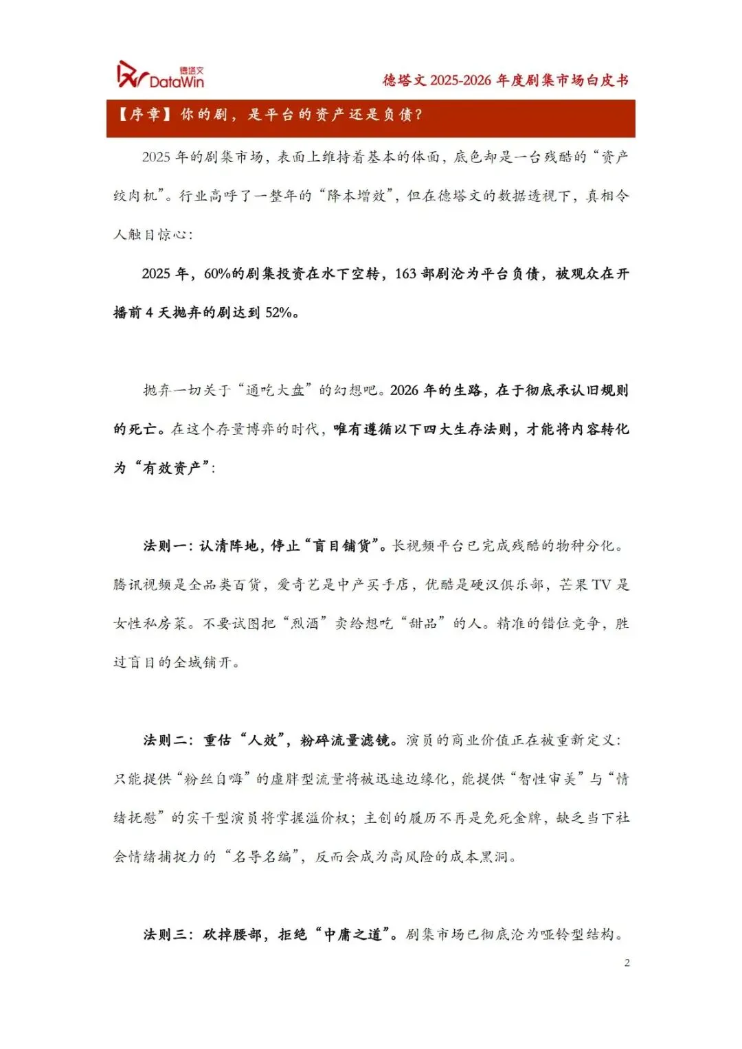 2025年剧集市场在降本增效的行业基调下,呈现出存量博弈的残酷格局,超六成剧集投资未能实现有效转化,大量作品沦为平台负债,观众观剧耐心持续稀释,有效播剧比例显著下滑。长视频平台完成差异化分化,从全域竞争转向圈地深耕,腾讯视频、爱奇艺、优酷、芒果TV各自确立核心赛道与用户定位。行业对内容资产的评判标准重构,演员与主创价值从流量导向转向效能导向,虚胖型流量被边缘化,具备真实感与情绪价值的实干型创作者更具市场竞争力。 市场结构呈现哑铃型特征,S+级重工业剧集以视听质感与叙事厚度构筑壁垒,A/B级垂类特种兵剧集凭极致长板实现圈层突围,而中庸化的中间态作品成为投资雷区。观众对悬浮叙事、工业糖精等内容产生抵触,真实感、智性审美与情绪代偿成为内容核心竞争力。同时,中剧兴起与AI技术应用推动行业变革,传统创作模式面临洗牌,唯有回归内容本质、精准契合市场需求,才能在2026年的行业进化中占据优势。