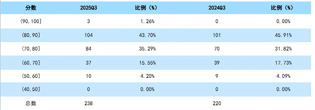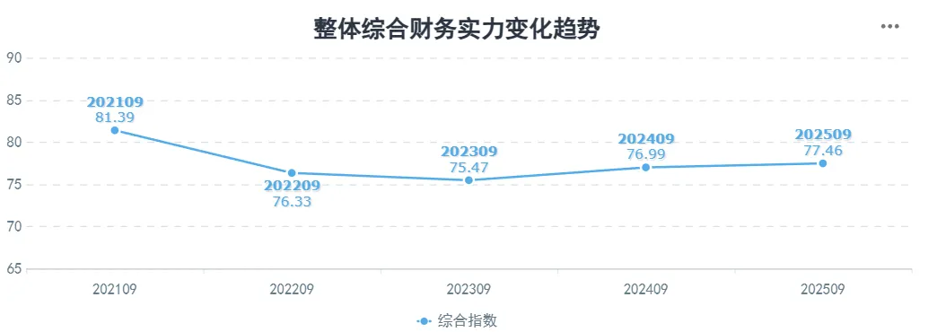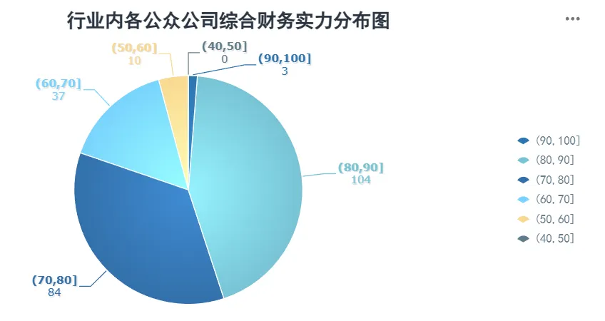 行业所有公众公司综合财务实力统计均值为77.44, 极差值为51.70,标准差9.24。