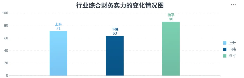 | 本行业综合财务实力变化情况是指行业内公司综合财务实力分数相较于过去一年中的同比变动幅度大于等于5%以上的情况, 其中变动分为上升和下降,此外变动浮动小于5%以内,定义为持平,反映了行业内不同受评主体综合财务实力变化的趋势。 |