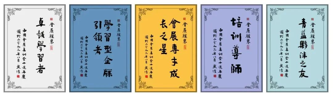 为庆贺中国会展集训营创办十周年,中国会展集训营承办机构专门制作了五种纪念牌,赠送十年来共同奔赴的学员、讲师、合作伙伴,以此留念。五种纪念牌如下: