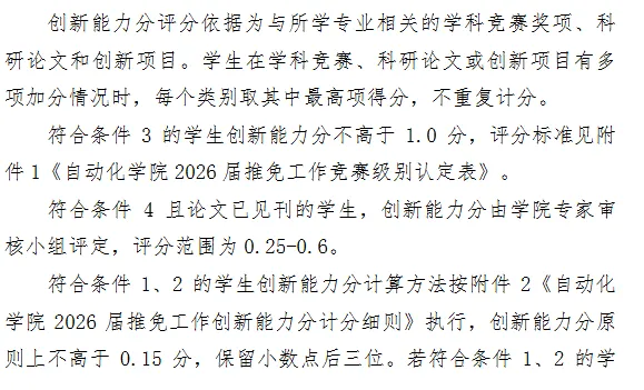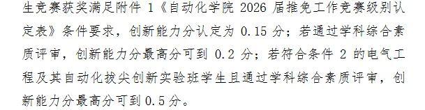 必修课程平均学分绩点在专业排名前45%,且本科阶段在《自动化学院2026届推免工作竞赛级别认定表》所列范围内的I级甲等、I级乙等竞赛中获得前三等次奖项或在II级甲等竞赛(全国赛)中获得前二等次奖项。