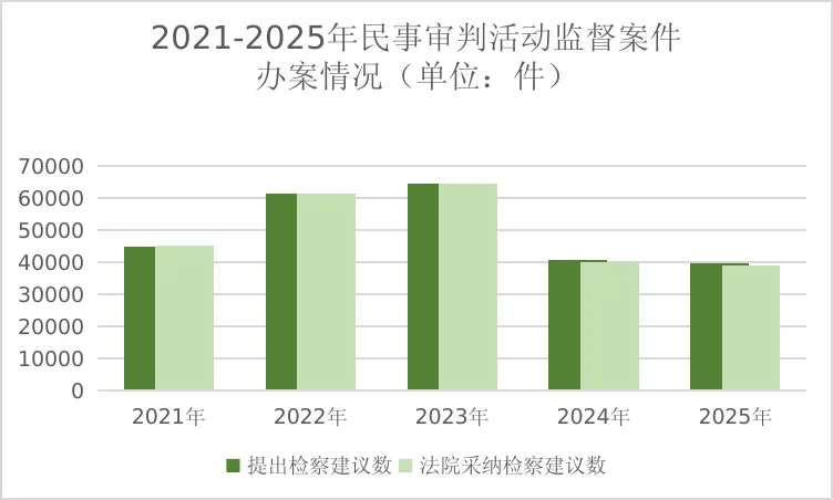 2025年,全国检察机关共受理民事生效裁判监督案件84851件,同比上升1.4%。近五年基本保持8万件的办案数量(2021年至2024年分别为81974件、69774件、83780件、83703件)。检察机关受理监督案件数量约占法院审查案件数的四分之一(2024年全国法院办理民事申请再审审查案件320145件),办案数量总体平稳。