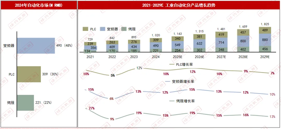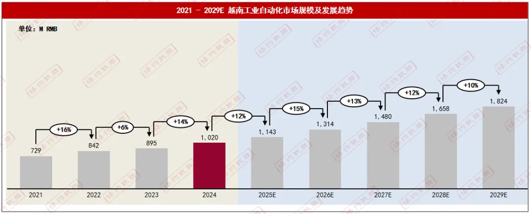 越南工业自动化产品市场约10亿元,2022年疫情结束,中国海外产业转移加快,2024年自动化市场增长14%,其中表现较为突出的包装,纺织,电子装配,汽车,塑料,电梯等行业。