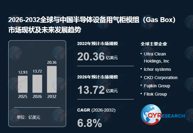 根据QYR(恒州博智)的统计及预测,2025年全球半导体设备用气柜模组(Gas Box)市场销售额达到了12.93亿美元,预计2032年将达到20.36亿美元,年复合增长率(CAGR)为6.8%(2026-2032)。