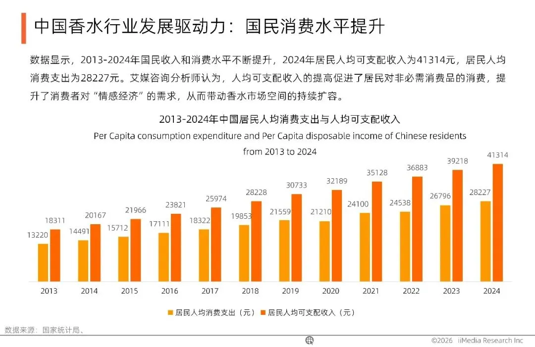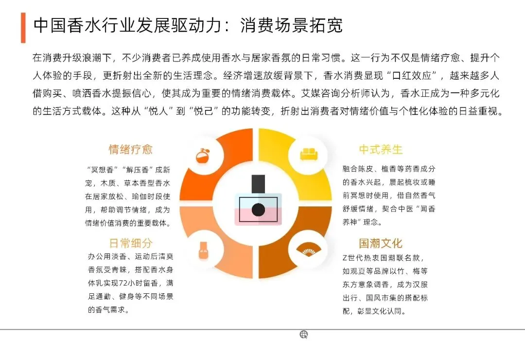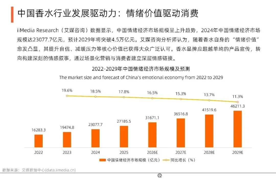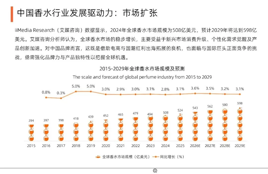 随着悦己消费理念的深化与消费场景的持续拓宽,消费者:对香水的需求向日常化、个性化延伸,为中国香水市场增长奠定了坚实基础。iiMedia Research(艾谋咨询)数据显示,2024年中国香水市场规模已达250亿元,预计2029年有望达到515亿元。相较于成熟的国际市场,中国香水市场仍处于蓝海阶段,未来有望成为全球香水市场增长的重要引擎。