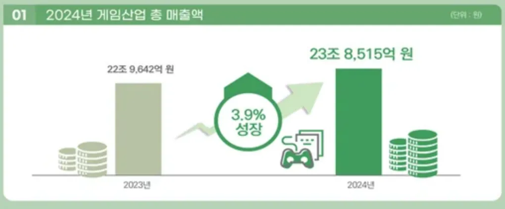 数据显示,2024年韩国国内游戏产业销售额同比增长3.9%,达23.85万亿韩元(约合人民币1097亿元);出口额增长1.3%,录得85.34亿美元(约合人民币620亿元),韩国游戏产业在全球竞争格局中继续保持强劲态势。