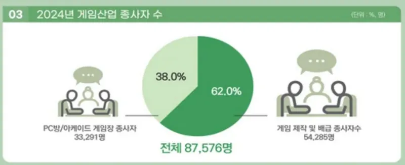 而转型自然在2024年,带来了对于人才的明显需求,韩国国内游戏产业从业人数同比增长3.1%,共计87576人。其中游戏制作及发行业从业者54285人(62.0%),流通业从业者33291人(38.0%),制作与发行为核心的人才结构得以延续。