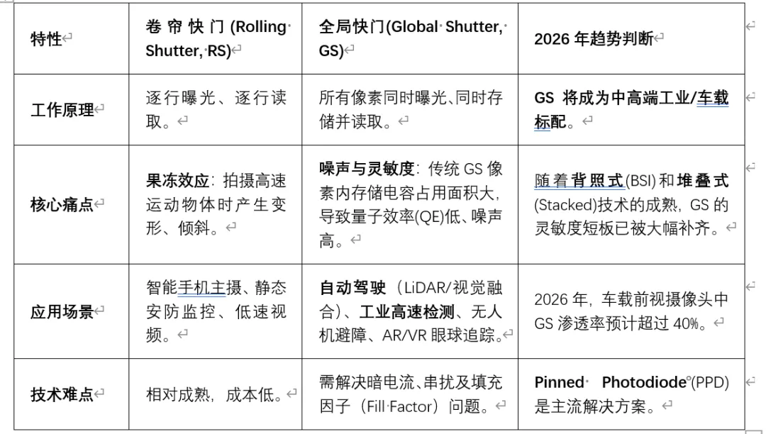 2.1 曝光方式:卷帘快门 (RS) vs. 全局快门 (GS)