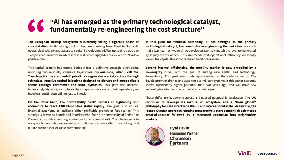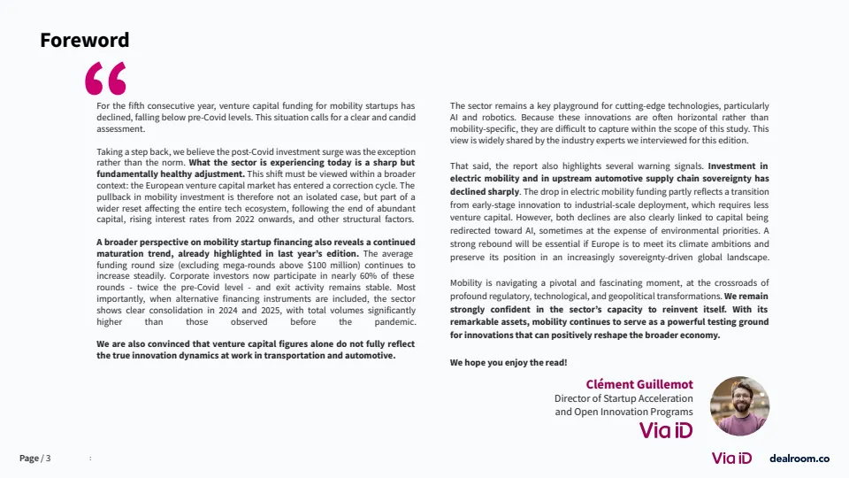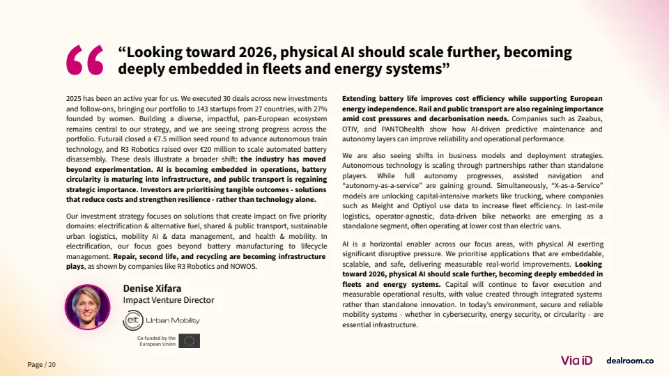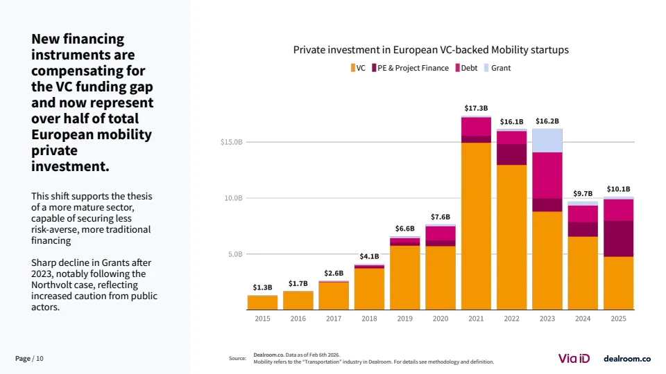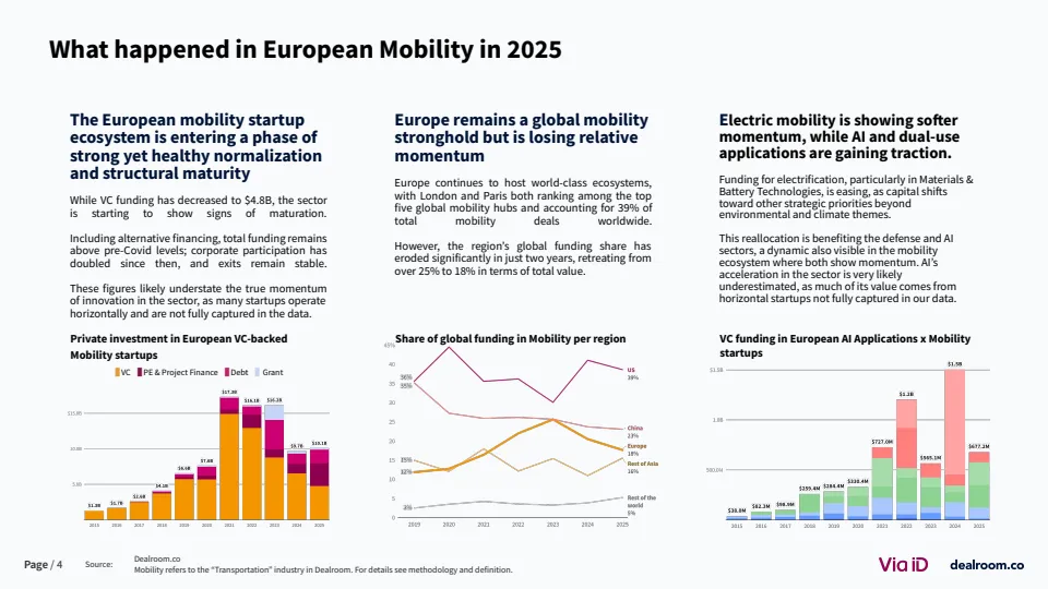 值得注意的是,电动化赛道明显降温。电池与充电基础设施融资占比从2023年的60%降至约20%,整体电动出行融资较2021-2023年平均水平下降39% 。与此同时,人工智能与军民两用技术成为新热点,其中相关融资五年增长达4倍。这反映出资本在地缘政治与技术周期驱动下,正从“绿色优先”转向“效率与安全优先”。