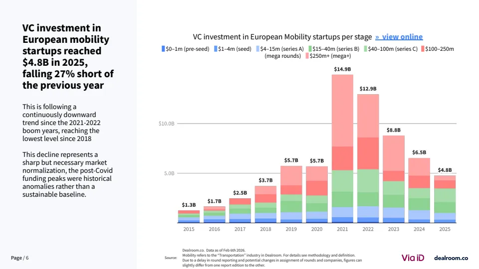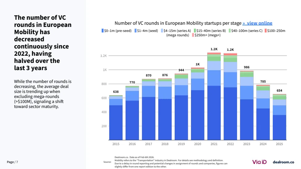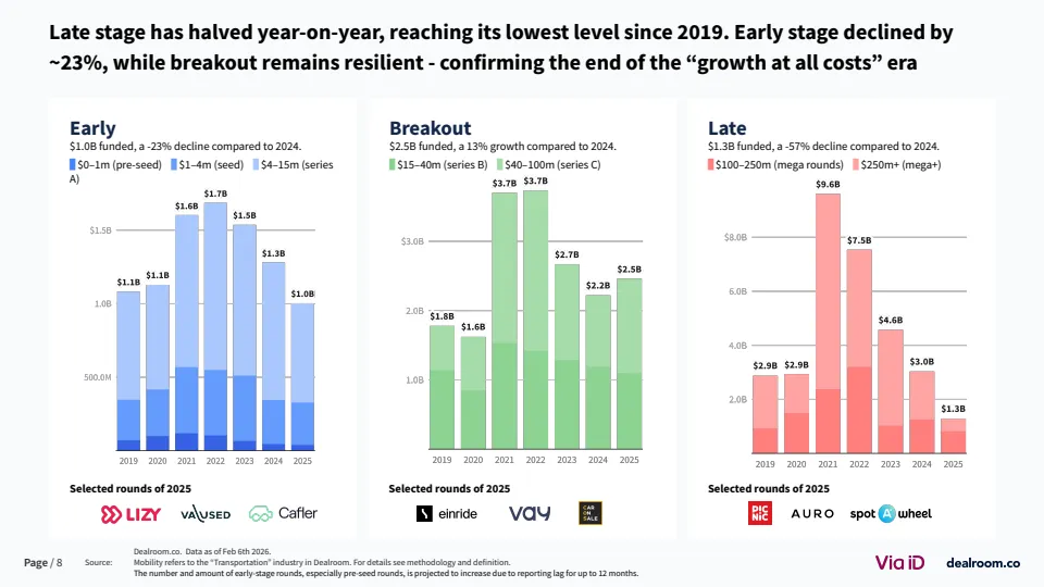2025年欧洲移动出行行业正经历显著的资本收缩与结构重塑。数据显示,风险投资总额降至48亿美元,同比下降27%,并已连续五年下滑,回落至2018年以来最低水平 。与此同时,欧洲整体风投市场却实现18%的增长,显示出资金正向其他赛道转移。这一变化本质上是疫情后资本过剩的修正,标志着行业从非理性扩张进入理性配置阶段。