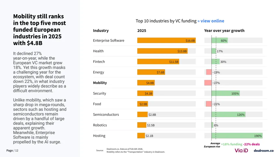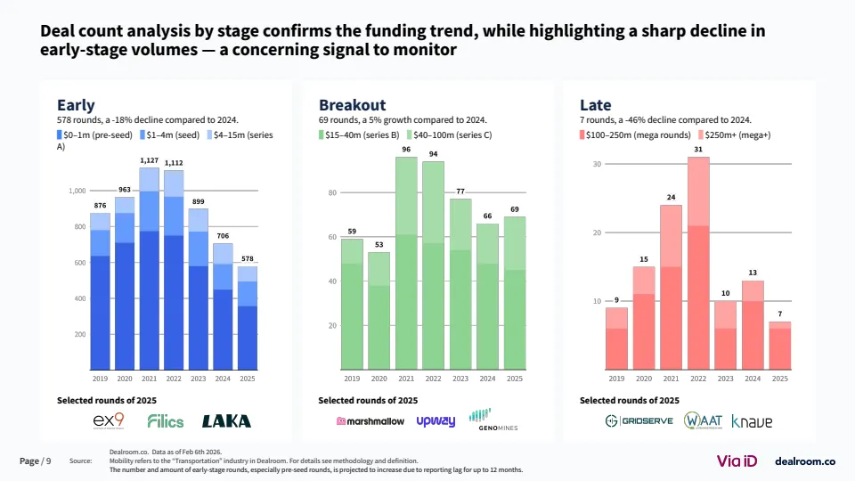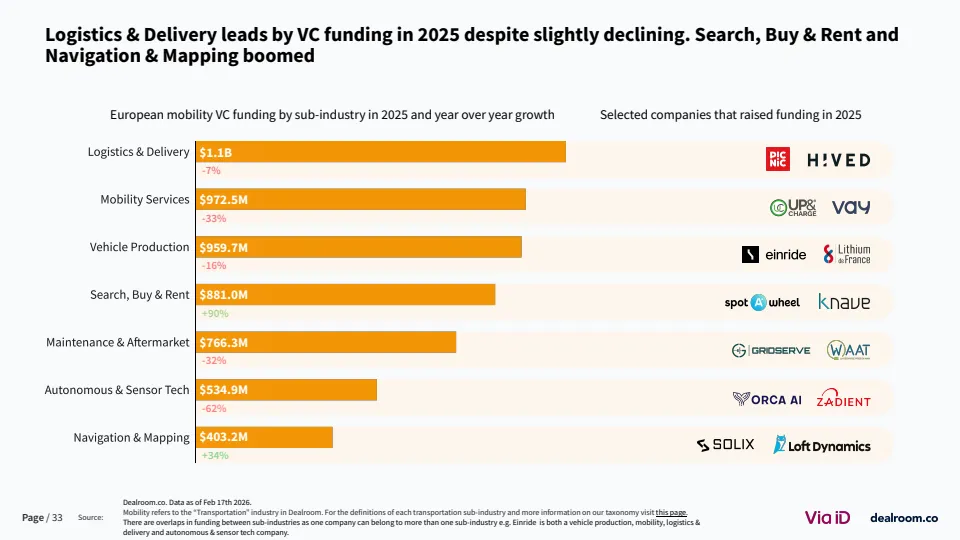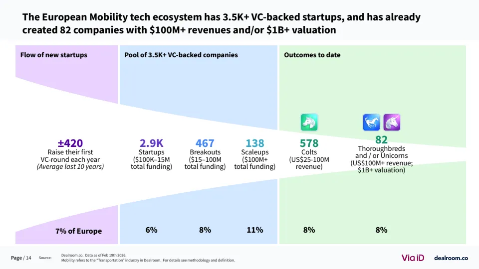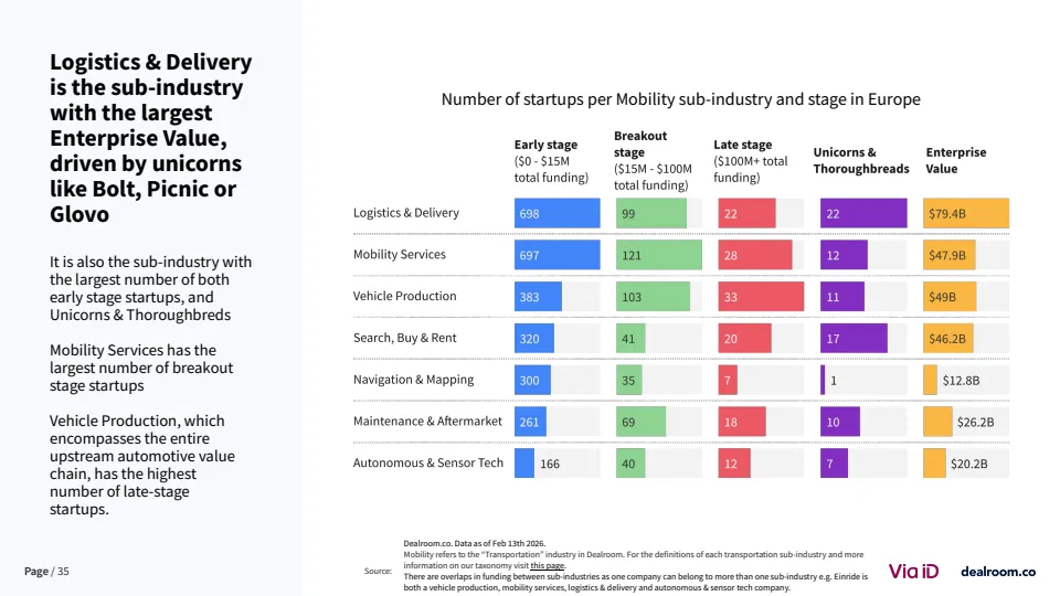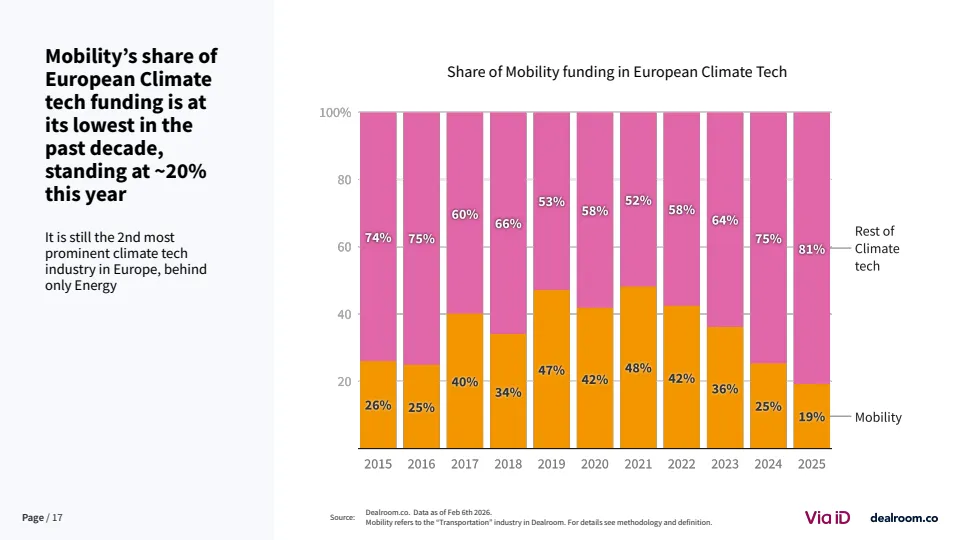 从生态层面看,欧洲已形成超过3500家风投支持的移动出行企业,其中82家成长为独角兽或高收入企业 。同时,该领域在气候科技中的占比降至约20%,为十年最低,但仍是第二大子赛道。这说明其战略重要性未变,但资本优先级有所调整。