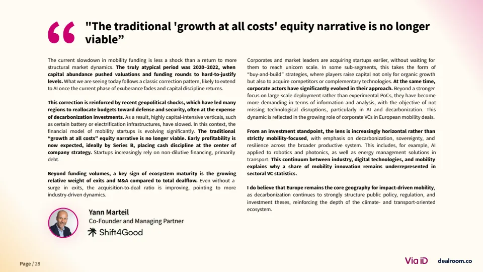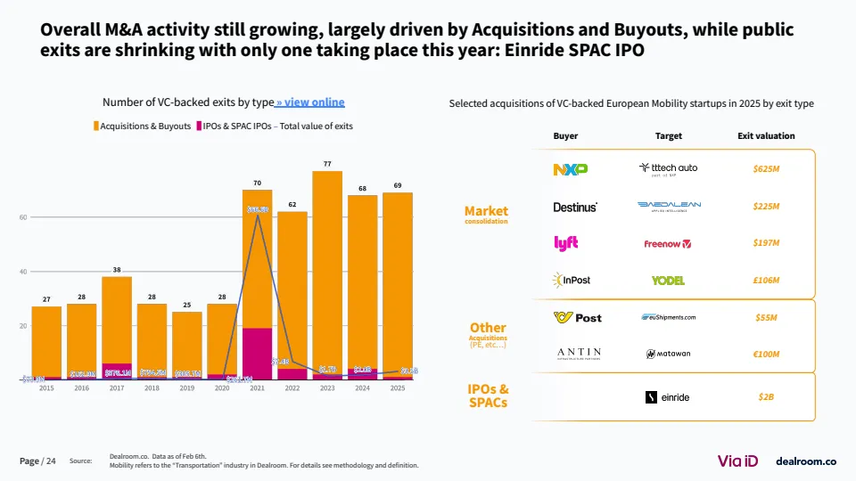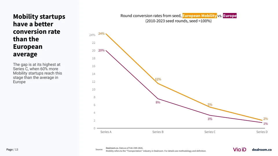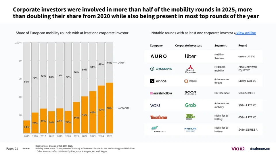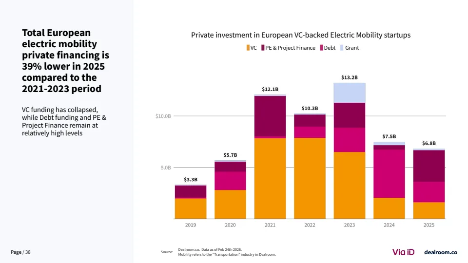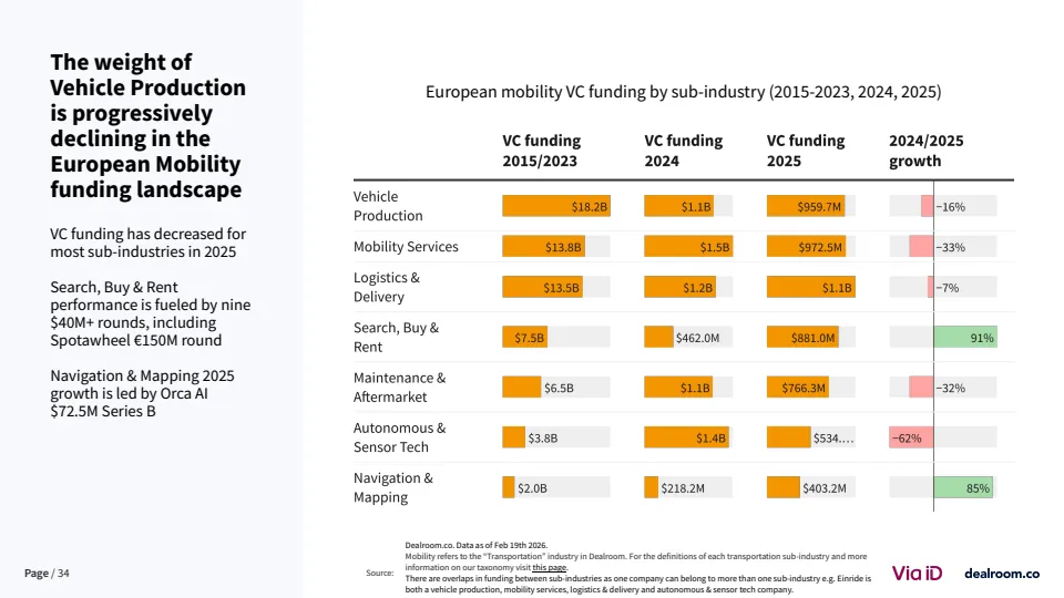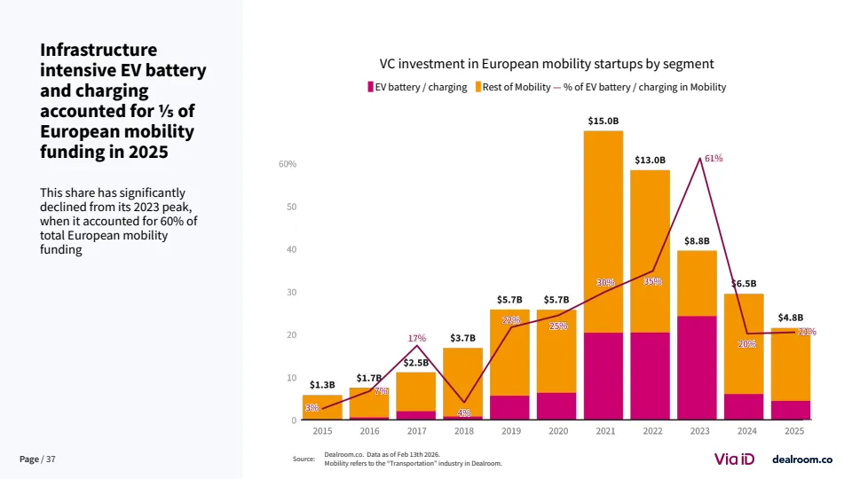 从生态层面看,欧洲已形成超过3500家风投支持的移动出行企业,其中82家成长为独角兽或高收入企业 。同时,该领域在气候科技中的占比降至约20%,为十年最低,但仍是第二大子赛道。这说明其战略重要性未变,但资本优先级有所调整。