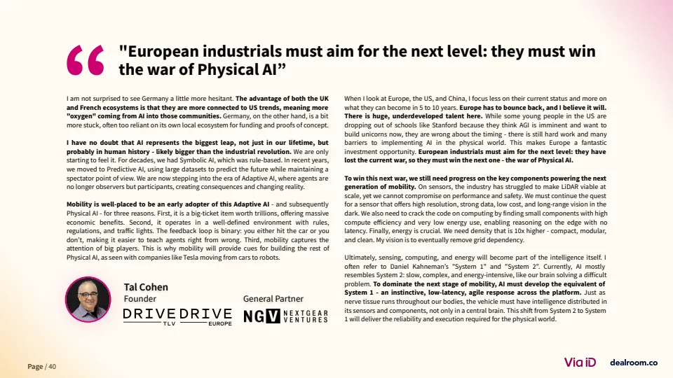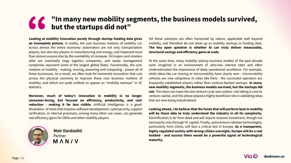 整体来看,欧洲移动出行正从“资本驱动”转向“效率驱动”。未来趋势将呈现三大方向:一是AI尤其是“物理AI”将深度嵌入交通与能源系统;二是融资结构持续向债务与产业资本倾斜;三是行业将加速整合,盈利能力与现金流成为核心指标。在资本约束与技术跃迁并存的背景下,具备产业协同与运营能力的企业将成为新一轮周期的主导者。