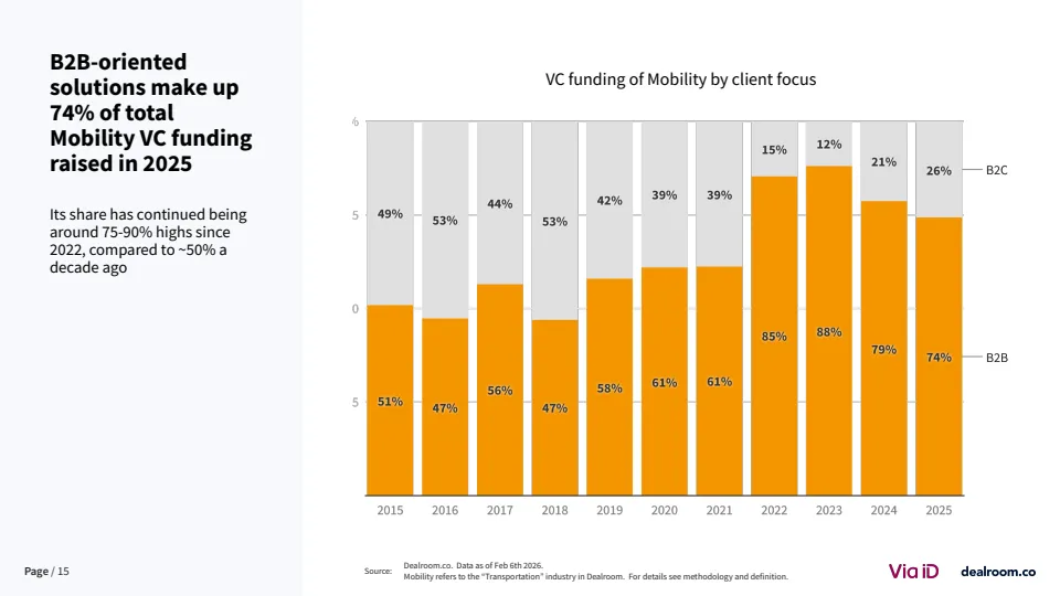 从行业结构看,B2B模式占据主导地位。2025年面向企业的解决方案占融资总额的74%,较十年前约50%的水平显著提升 。同时,轻资产与数字化模式占比稳定在50%,而深科技硬件占比从2023年的41%下降至25%。这表明资本更青睐可扩展、回报周期更短的商业模式,而对重资产制造环节趋于谨慎。