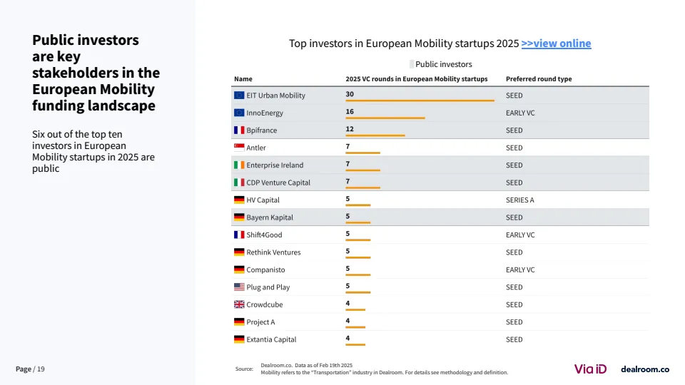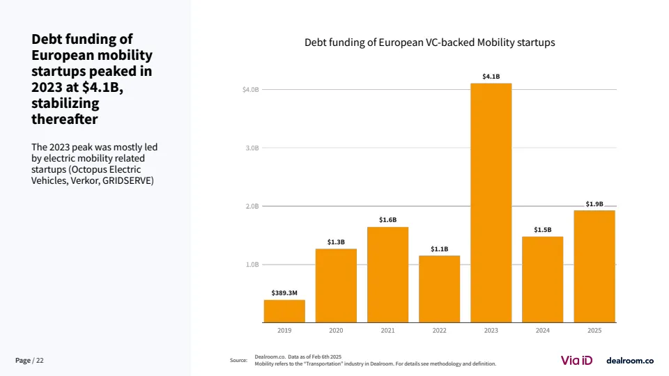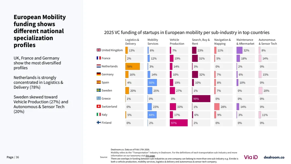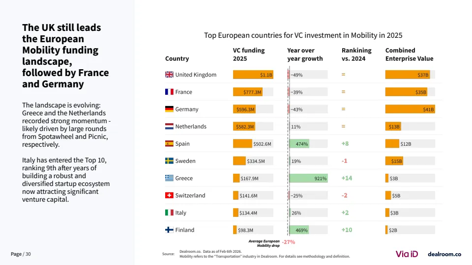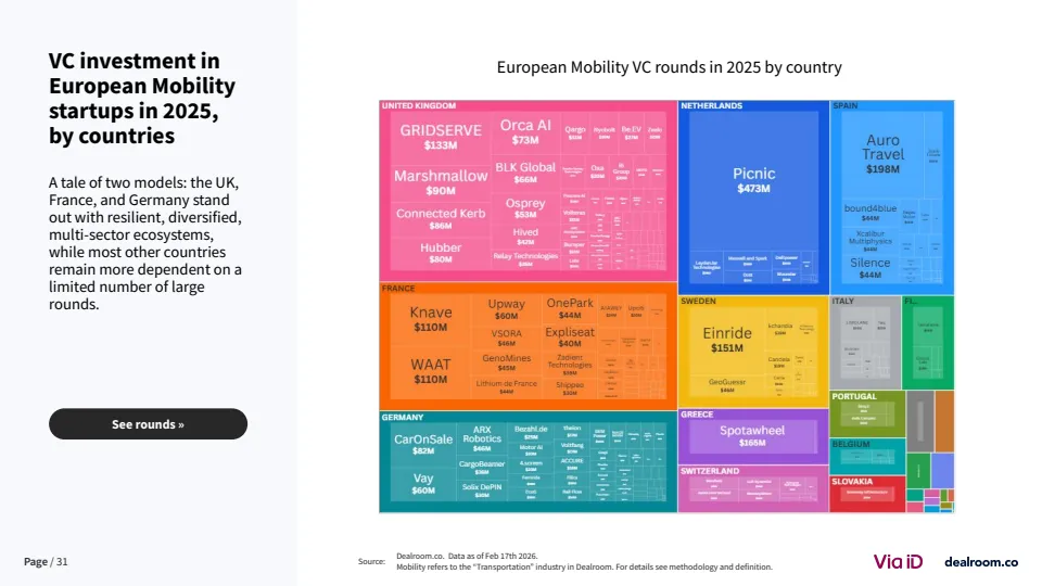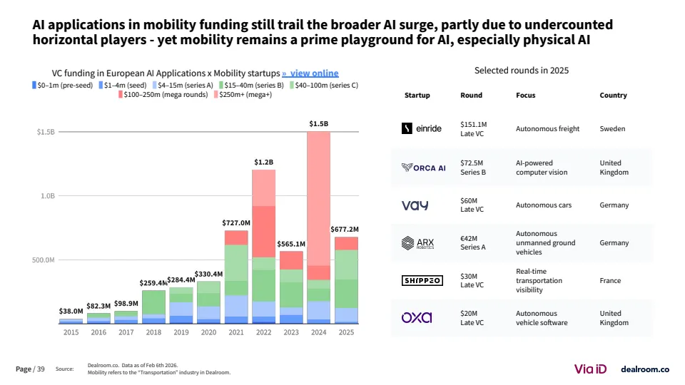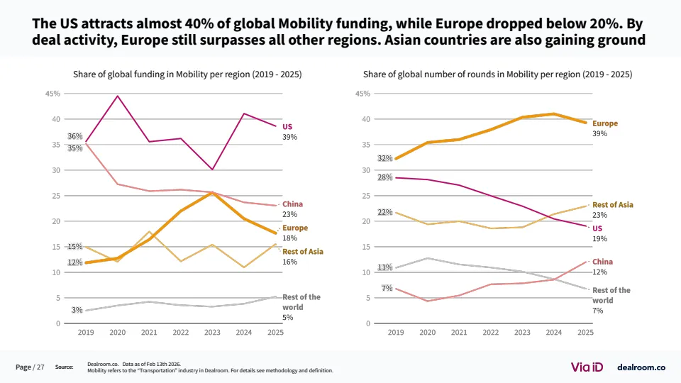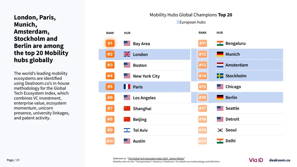 在全球格局中,欧洲竞争力出现边际下滑。其在全球移动出行融资中的占比已从25%以上降至18%,而美国吸引近40%的资金 。尽管如此,欧洲在交易数量上仍保持领先,伦敦与巴黎贡献全球39%的交易量,显示其生态活跃度依然稳固。