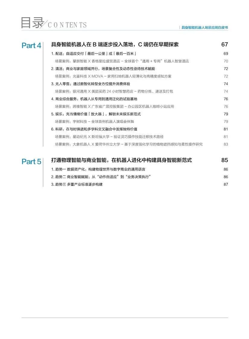 •   商业服务场景(进行时):在酒店配送(擎朗智能)、无人零售(银河通用)、清洁(光鉴科技)等领域已实现批量化落地,核心解决人力短缺与标准化服务问题。报告也指出,娱乐、家庭陪伴等C端场景仍处早期,对情感交互、安全性和成本的要求极高。