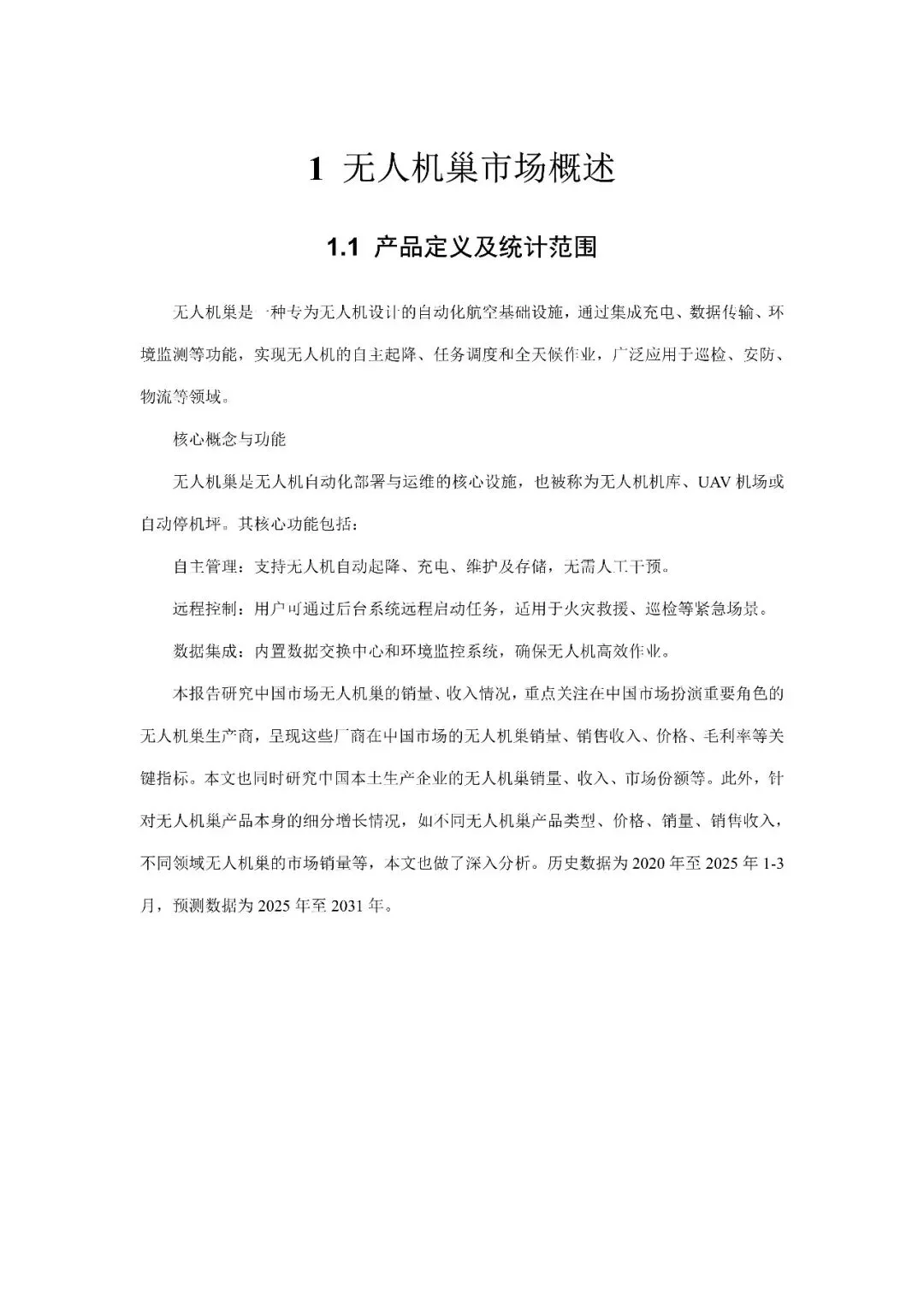 本报告研究中国市场无人机巢的销量、收入情况,重点关注在中国市场扮演重要角色的无人机巢生产商,呈现这些厂商在中国市场的无人机巢销量、销售收入、价格、毛利率等关键指标。本文也同时研究中国本土产企业的无人机巢销量、收入、市场份额等。此外,针对无人机巢产品本身的细分增长情况,如不同无人机巢产品类型、价格、销量、销售收入,不同领域无人机巢的市场销量等,本文也做了深入分析。历史数据为2020年至2025年1-3月,预测数据为2025年至2031年。