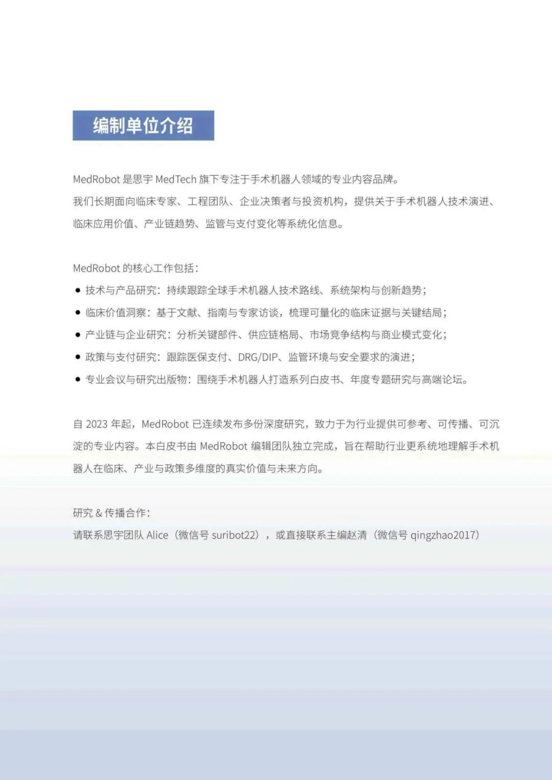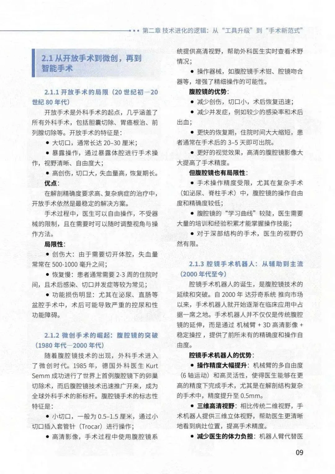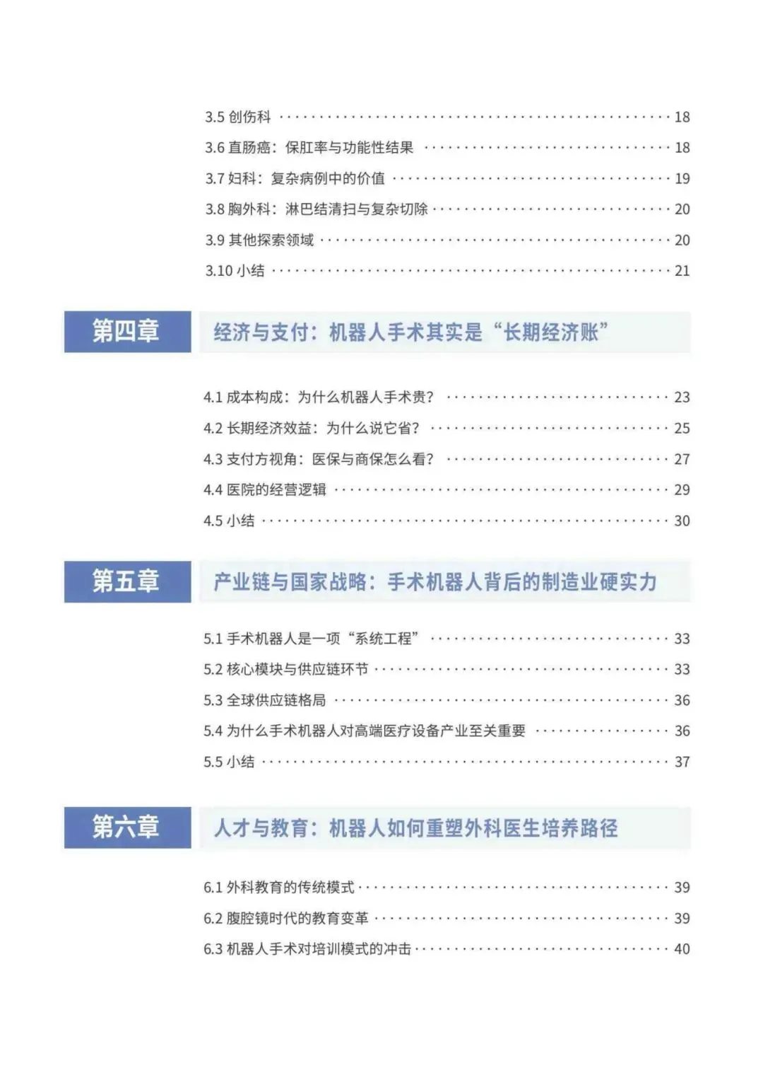 技术演化呈现多维度突破:手术机器人从腹腔镜技术升级而来,通过机械臂多自由度操作、3D 高清视野、力反馈等技术,实现从 “工具升级” 到 “手术新范式” 的跨越。未来将向 AI 深度融合、多模态成像、远程手术方向发展,推动外科向精细化、智能化转型。 临床价值聚焦关键结局改善:在泌尿外科(前列腺癌手术控尿与性功能保留)、骨科(毫米级置钉精度)、直肠癌(保肛率提升)、妇科(复杂病例安全性提高)等领域,手术机器人显著降低并发症率、缩短住院时间、改善长期生活质量,其核心价值从 “微创” 转向 “功能保留与疾病控制”。 经济支付呈现 “长期划算” 逻辑:短期来看,手术机器人设备购置(500 万 - 3000 万元)、耗材与维护成本较高,但长期可通过缩短住院周期、减少并发症与二次手术、降低护理依赖等实现成本节约。支付方态度分化,美国依赖市场竞争,欧洲循证驱动,中国逐步通过医保试点与国产化降低负担。 产业链彰显国家制造硬实力:手术机器人是多学科融合的系统工程,核心模块涵盖成像光学、传感定位、机械执行、材料零部件与软件算法。全球格局呈现美国整机垄断、欧洲光学材料领先、日本精密部件优势,中国国产化企业在政策支持下快速崛起,推动产业链协同升级。 重塑外科医生培养体系:传统师徒制与腹腔镜时代的长学习曲线被打破,手术机器人通过控制台带教、手术录像复盘、模拟器训练、AI 辅助评估等方式,缩短学习周期(如前列腺癌根治术学习曲线从 200 + 例降至 50-100 例),推动外科教育向标准化、数据化、智能化转型。