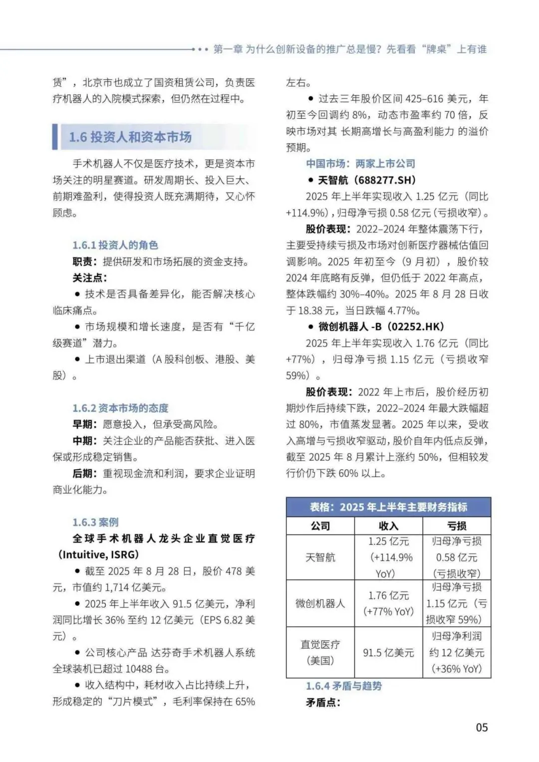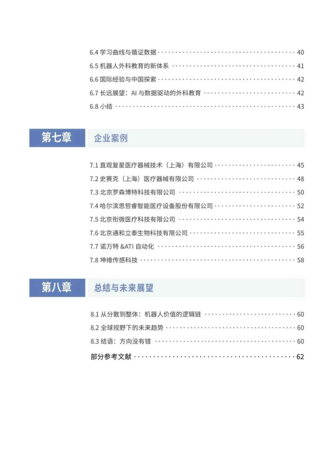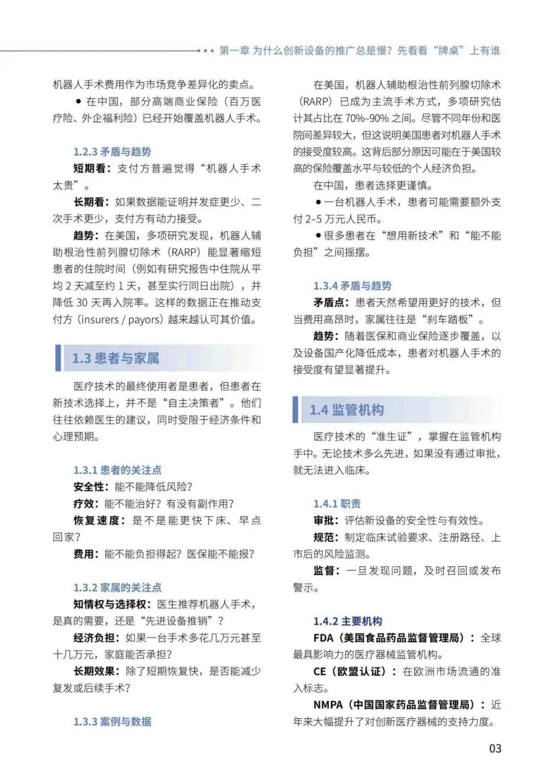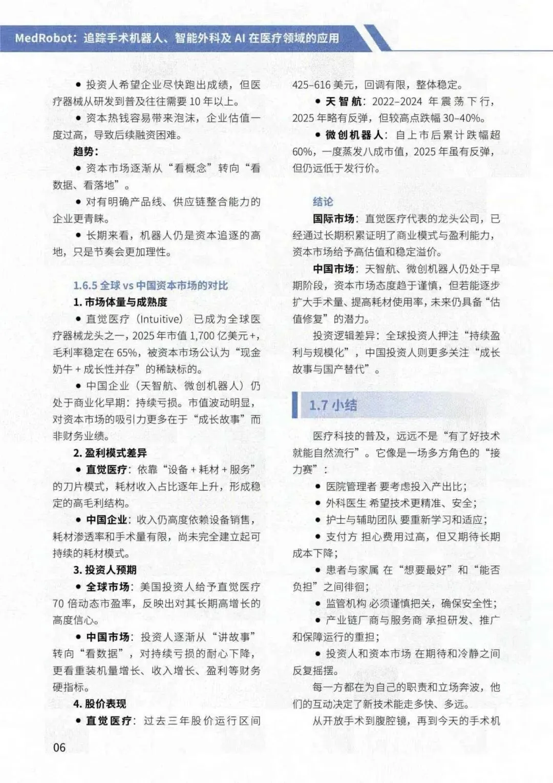 技术演化呈现多维度突破:手术机器人从腹腔镜技术升级而来,通过机械臂多自由度操作、3D 高清视野、力反馈等技术,实现从 “工具升级” 到 “手术新范式” 的跨越。未来将向 AI 深度融合、多模态成像、远程手术方向发展,推动外科向精细化、智能化转型。 临床价值聚焦关键结局改善:在泌尿外科(前列腺癌手术控尿与性功能保留)、骨科(毫米级置钉精度)、直肠癌(保肛率提升)、妇科(复杂病例安全性提高)等领域,手术机器人显著降低并发症率、缩短住院时间、改善长期生活质量,其核心价值从 “微创” 转向 “功能保留与疾病控制”。 经济支付呈现 “长期划算” 逻辑:短期来看,手术机器人设备购置(500 万 - 3000 万元)、耗材与维护成本较高,但长期可通过缩短住院周期、减少并发症与二次手术、降低护理依赖等实现成本节约。支付方态度分化,美国依赖市场竞争,欧洲循证驱动,中国逐步通过医保试点与国产化降低负担。 产业链彰显国家制造硬实力:手术机器人是多学科融合的系统工程,核心模块涵盖成像光学、传感定位、机械执行、材料零部件与软件算法。全球格局呈现美国整机垄断、欧洲光学材料领先、日本精密部件优势,中国国产化企业在政策支持下快速崛起,推动产业链协同升级。 重塑外科医生培养体系:传统师徒制与腹腔镜时代的长学习曲线被打破,手术机器人通过控制台带教、手术录像复盘、模拟器训练、AI 辅助评估等方式,缩短学习周期(如前列腺癌根治术学习曲线从 200 + 例降至 50-100 例),推动外科教育向标准化、数据化、智能化转型。