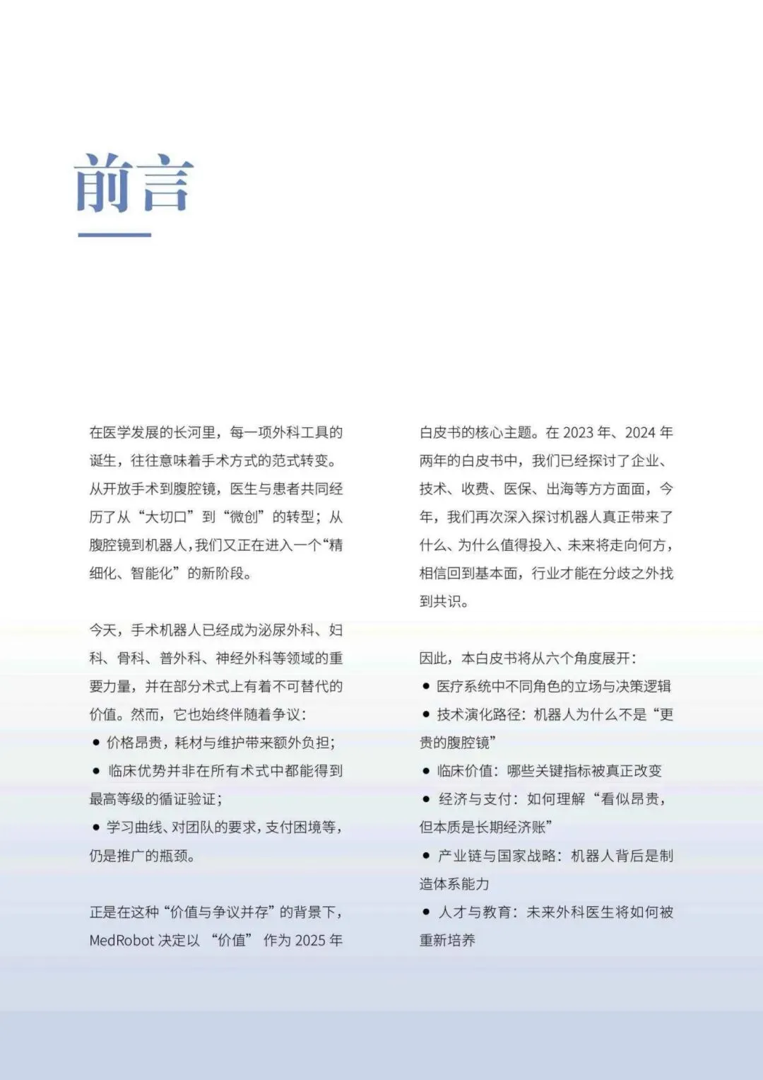 白皮书系统分析手术机器人的行业价值与发展趋势,从医疗系统多方角色、技术进化、临床效果、经济支付、产业链、人才教育六个维度展开,指出手术机器人虽面临价格高、推广慢等争议,但在精准医疗、功能保留、长期经济效益上具备不可替代的优势,是医疗装备升级与国家战略的重要方向。