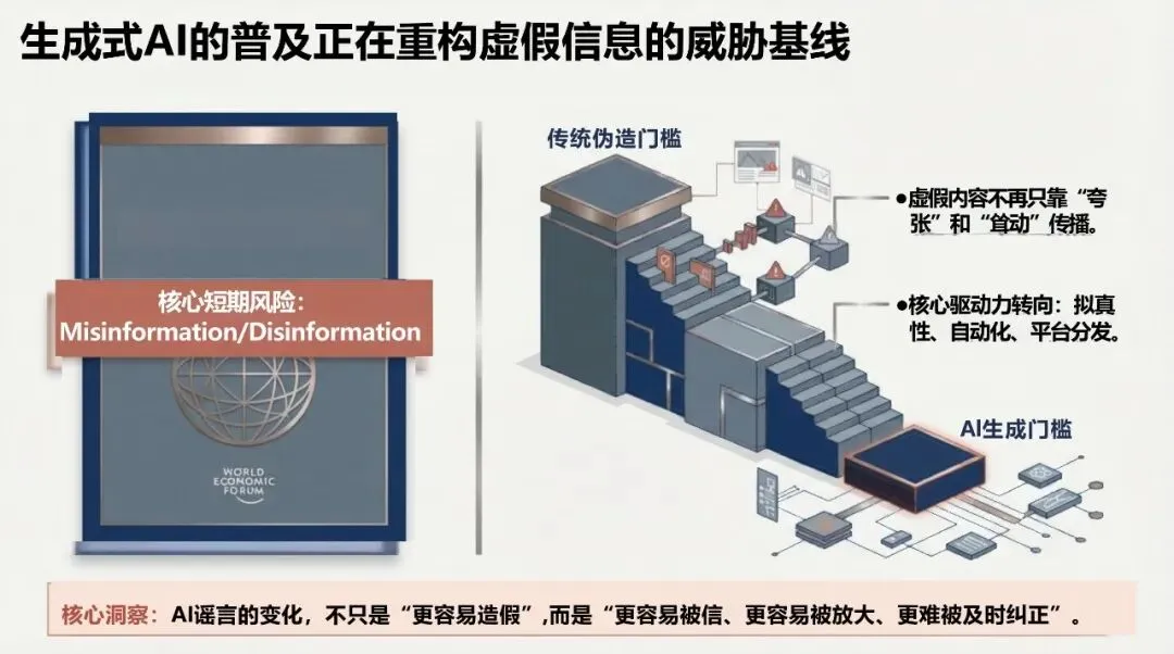 内容经核查为虚假或高度误导; AI在生成(如伪造文本/音视频)或传播(如机器人协同)中起关键作用。本质是利用技术拟真性劫持人类认知信任,导致“说谎者红利”(即虚假信息制造者获利)与系统性社会工程攻击。