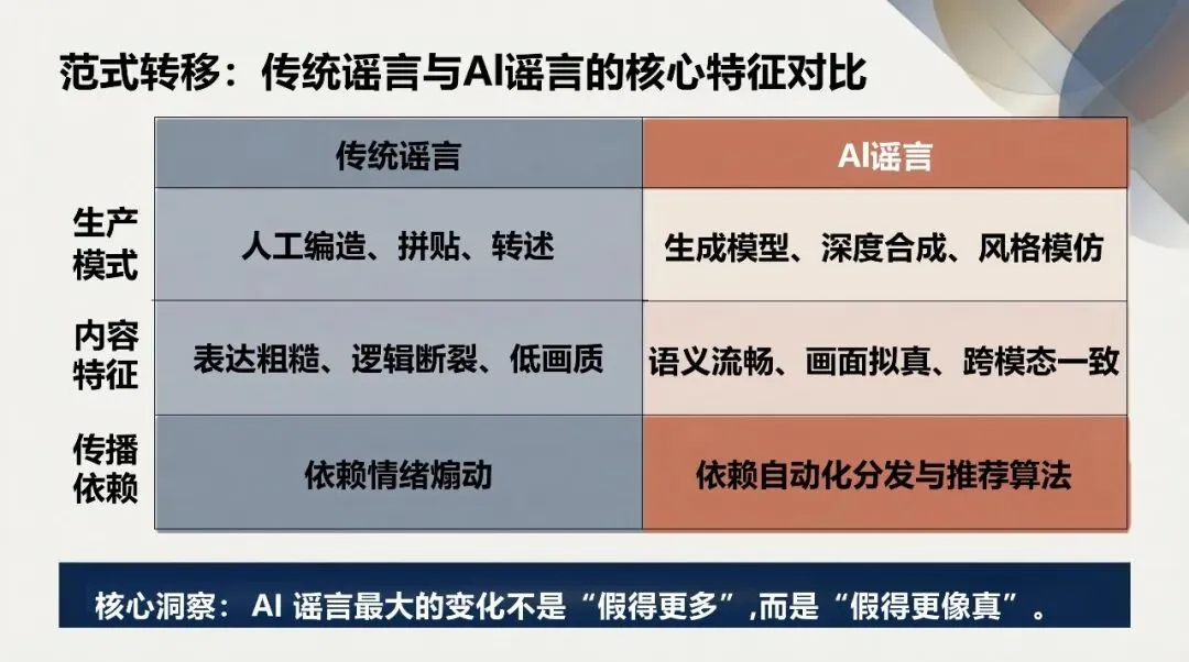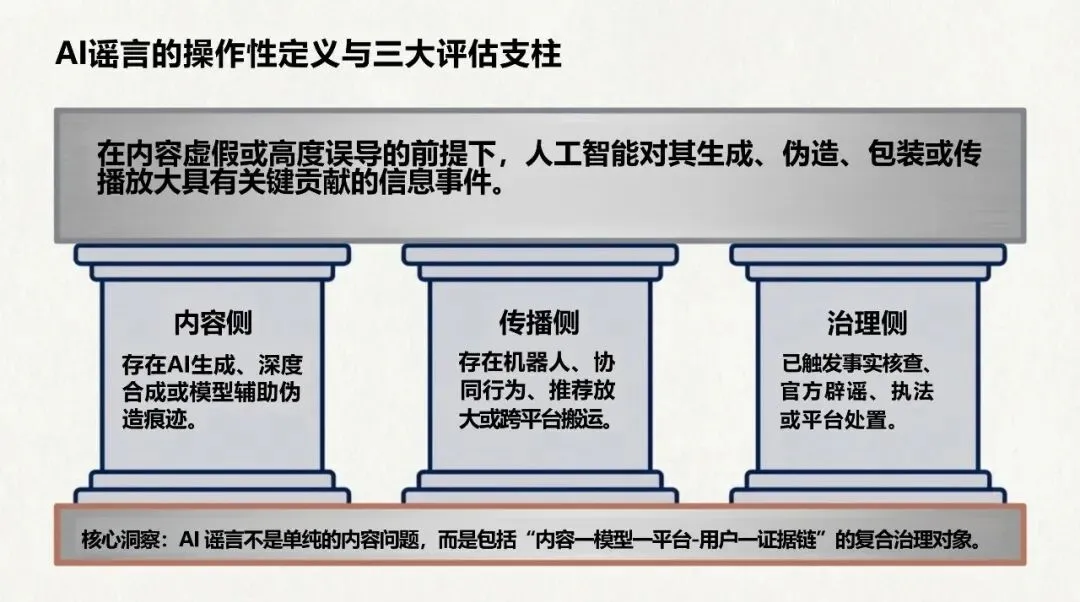 AI谣言已形成“工业化生产+算法化分发”的产业链,其定义为同时满足两个条件的可审计事件: