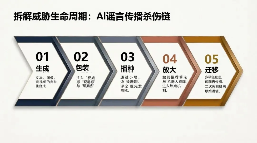 生成:批量制造高拟真文本/音视频(成本下降超90%); 包装:添加伪造的“权威报告”截图、专家背书; 播种:通过机器人账号矩阵在群聊、评论区投放; 放大:平台算法偏好高冲突内容,2小时可达百万传播量; 对抗迭代:遇辟谣时快速变异内容二次传播。实际损害: