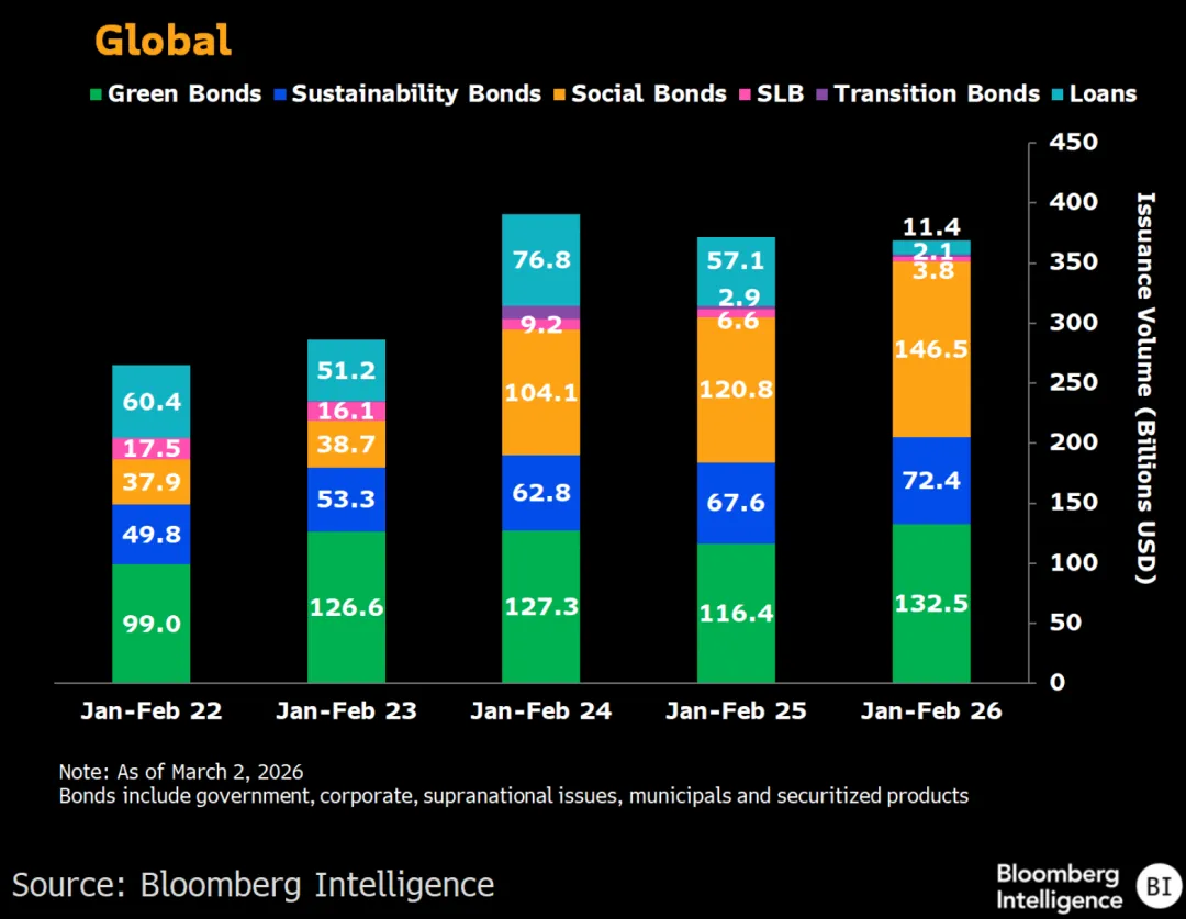 今年前两个月,全球可持续发展债务发行量连续第二年接近3,700亿美元,但仍低于2024年创下的纪录。绿色债券、社会债券及可持续发展债券的发行量均超过去年同期,其中社会债券以约40%的占比位居各券种之首。鉴于贷款交易数据的披露通常存在滞后,目前发行总量为3,690亿美元,实际上或许超越了2025年同期的3,715亿美元。与此同时,可持续发展挂钩债券和转型债券的发行量仍落后于去年同期水平。