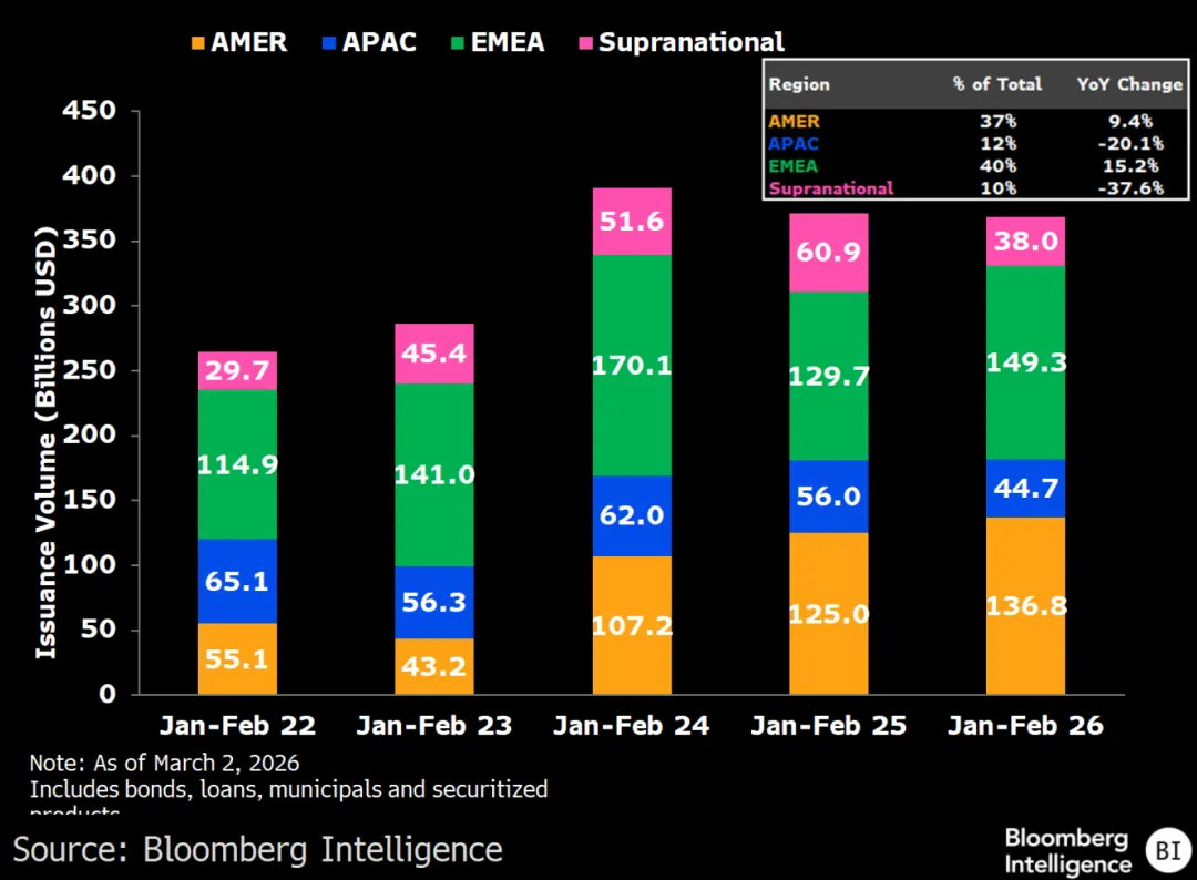 欧洲、中东和非洲地区是最大的贡献者,发行量达1,493亿美元(占总量的40%),较2025年同期增加约150亿美元。受证券化产品持续增长的推动,美洲地区今年前两个月的发行量增长9%。该地区以1,368亿美元的发行量位居第二,占发行总量的37%。