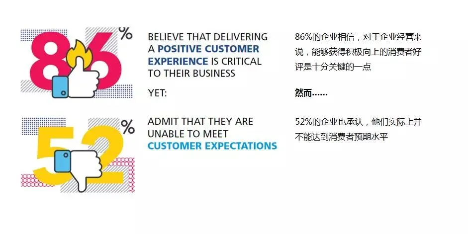 虽然86%的零售商都认为,一个好的顾客体验是他们经营销售中的一项重要指标,但超过半数的零售商也不得不承认,他们其实并没有完全达到顾客的预期水平。