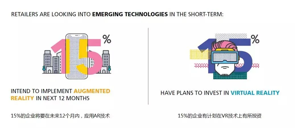 调查发现:不是在今后1年,就是在今后的2-4年内,大量零售商正在考虑对这些新兴技术进行支出预算。约有15%的零售商反馈:他们在今后的一年里打算对AR或VR技术进行投资;同时,有超过20%的零售商打算在今后的2-4年内对一些新兴技术进行投资利用。