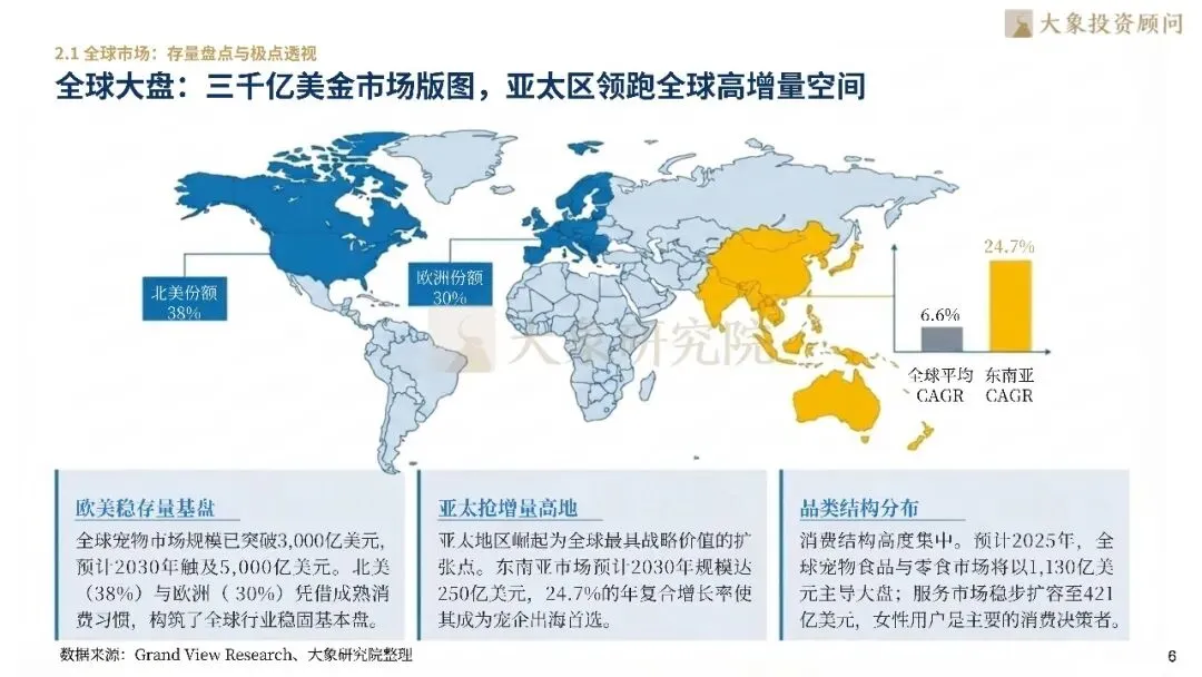全球宠物市场规模已突破3,000亿美元,北美与欧洲构筑了稳固存量基盘,东南亚则以24.7%的年复合增长率成为高增高地。中国市场2024年消费规模突破3,002亿元,增速达7.5%。目前中国养宠渗透率仅约20%,远低于美日等成熟市场(>65%),预示未来有4-8倍增长空间。此外,中国呈现“大行业、小公司”格局,食品CR5仅24.5%,头部企业面临丰厚整合红利。消费结构上,猫经济全面逆袭,高端宠食占比超40%,且老龄化宠物的医疗花费呈现翻倍增长态势。