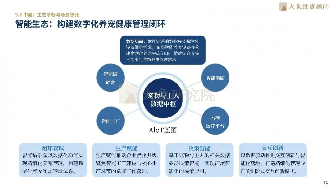 在上游,国产猫三联、驱虫药等新药正打破外资垄断,精准医疗普及支撑了高技术溢价。中游宠食进入“机能化”时代,低温烘焙工艺对传统高温膨化形成代际降维打击。头部品牌通过“五0添加”重塑信任,并利用一物一码实现全链溯源。行业正利用AIoT技术构建数字化养宠闭环,将智能设备与云端医疗融合,贴合精细化管理需求。下游医疗端,心脏、肿瘤等专科深耕成为ARPU提升的核心引擎,头部连锁医院通过高端影像诊断构筑专业信任壁垒,实现了从“低价平替”向“技术领先”的逻辑扭转。