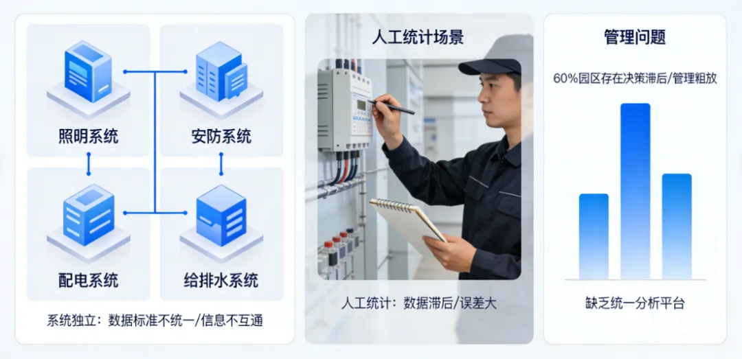 园区照明、安防、配电、给排水等系统相互独立,数据标准不统一、信息不互通,形成严重的数据孤岛。人工统计、人工抄表模式依旧普遍,数据滞后且误差大,缺乏统一分析平台,60% 以上的园区存在决策滞后、管理粗放的问题。