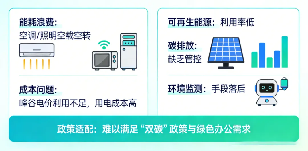 传统用能模式造成大量能耗浪费,空调、照明空载空转、峰谷电价利用不足,用电成本居高不下。同时可再生能源利用率低、碳排放缺乏管控,环境监测手段落后,难以适配 “双碳” 政策要求与绿色办公需求。