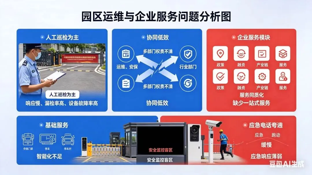园区运维以人工巡检为主,响应慢、漏检率高、设备故障率高,多部门权责不清导致协同低效。企业服务同质化严重,缺少政策、融资、产业链一站式服务;人员通行、停车、安防等基础服务智能化不足,安全监控存在盲区,应急响应能力薄弱。