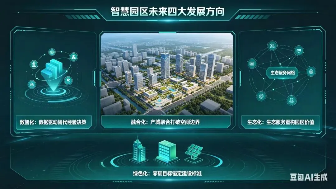 面向未来,智慧园区将朝着数智化、融合化、生态化、绿色化四大方向发展,以数据驱动替代经验决策,以产城融合打破空间边界,以生态服务重构园区价值,以零碳目标锚定建设标准。