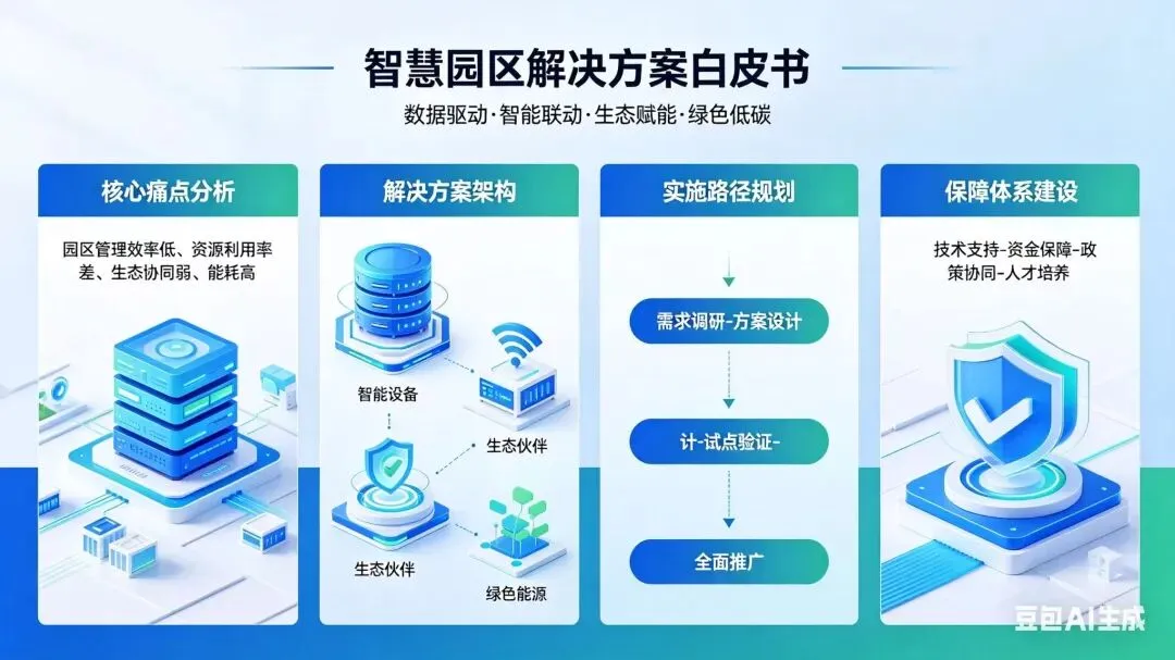 针对园区核心痛点,白皮书以数据驱动、智能联动、生态赋能、绿色低碳为核心,构建完整可落地的智慧园区解决方案,并配套清晰实施路径与保障体系
