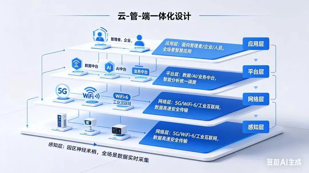 方案采用 “云 - 管 - 端” 一体化设计,搭建感知、网络、平台、应用四层协同架构。