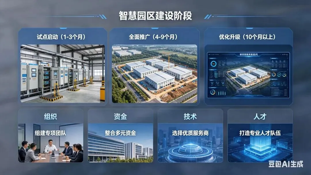 智慧园区建设分 ** 试点启动(1-3 个月)、全面推广(4-9 个月)、优化升级(10 个月以上)** 稳步推进,先试点验证、再全域覆盖、后长期迭代。
