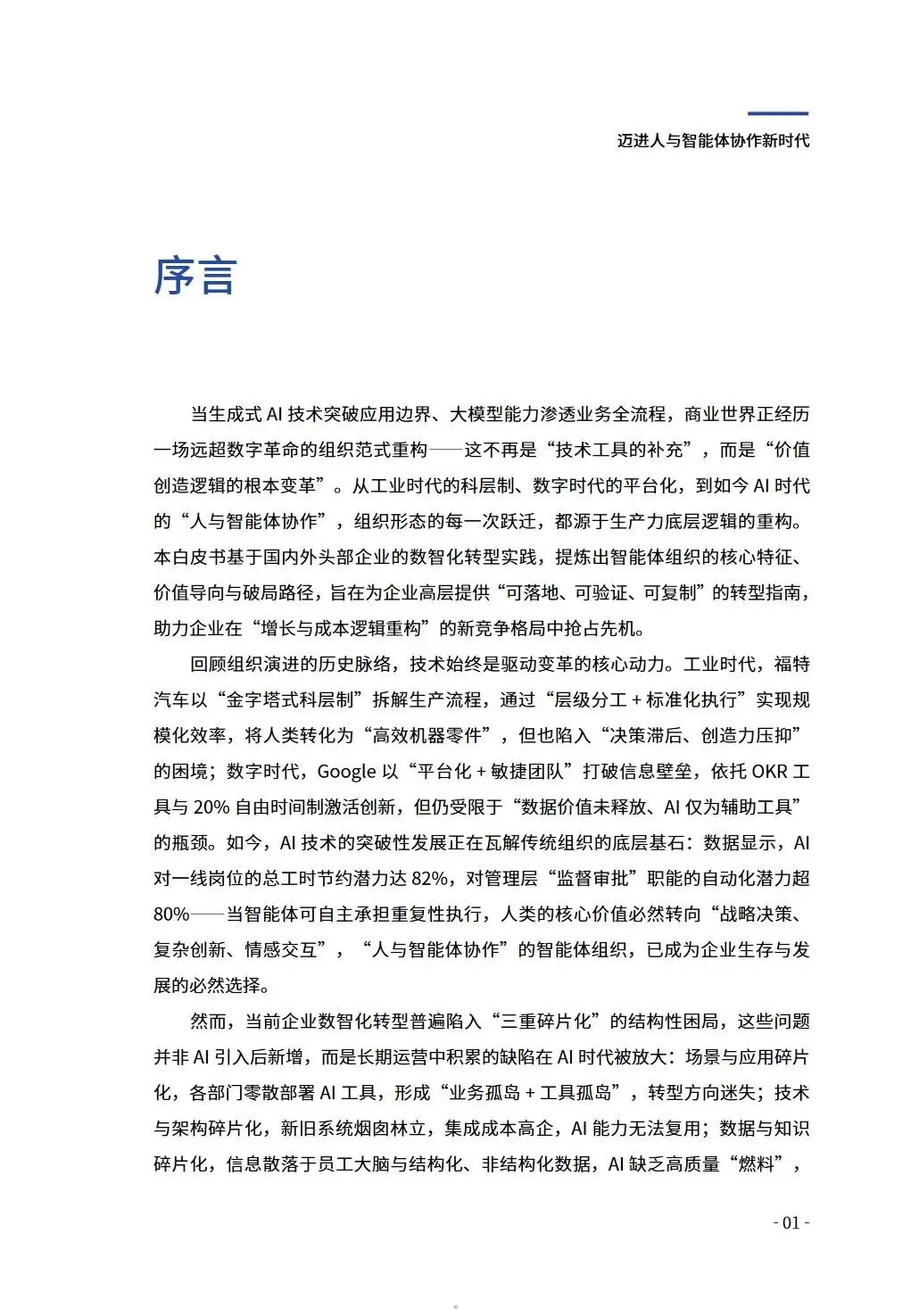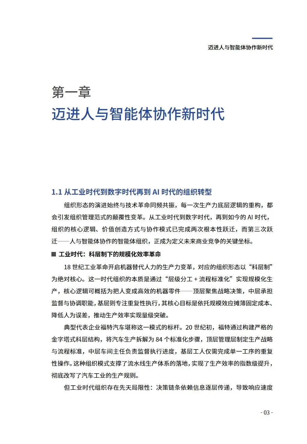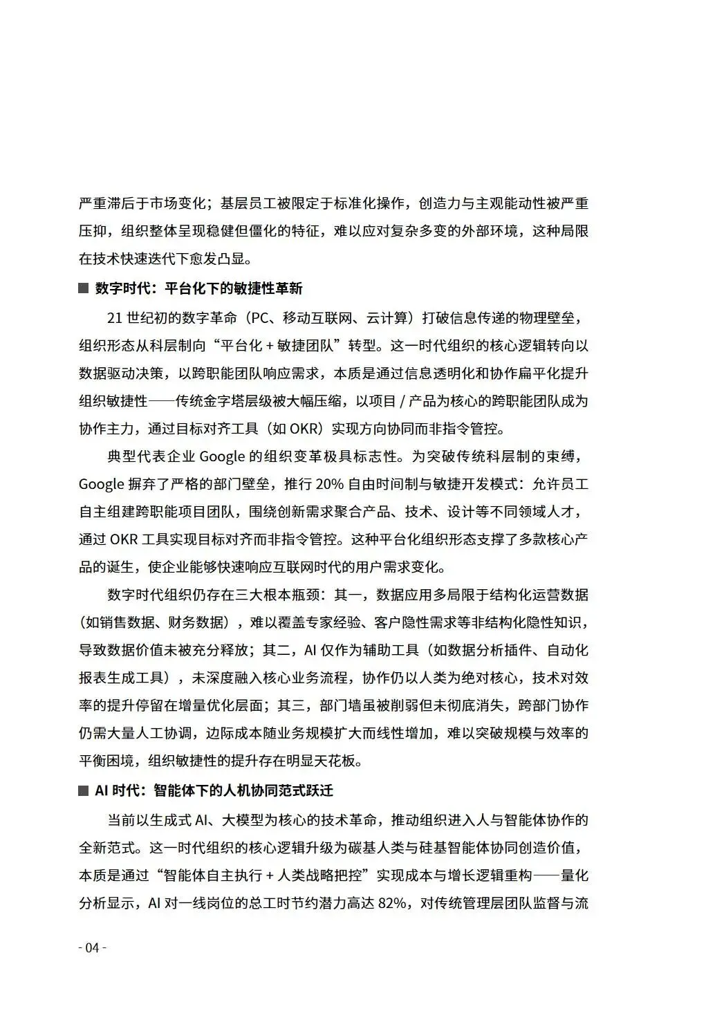 组织正站在从人类单驱动向人与智能体协作范式跃迁的历史关口。生成式AI的突破性发展,不仅在自动化重复性任务上展现出巨大潜力(一线岗位工时节约潜力高达82%),更在系统性瓦解传统科层制的底层逻辑,迫使企业重新思考价值创造的根本方式。