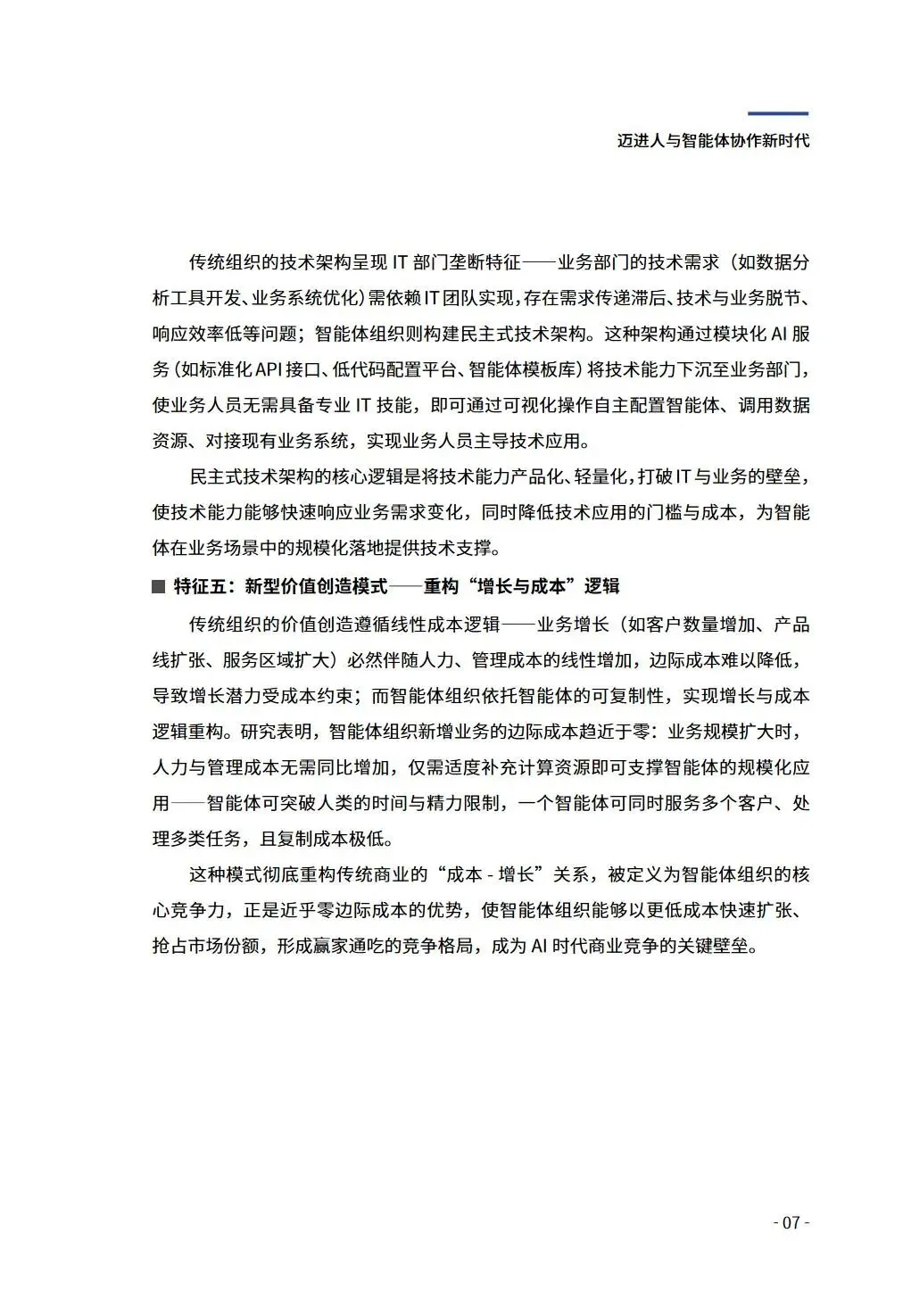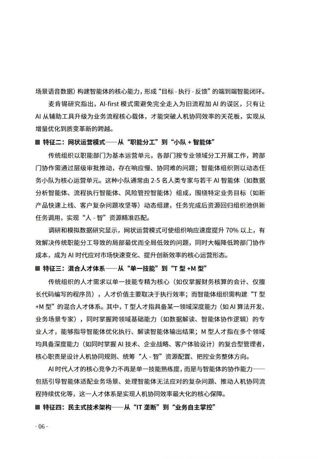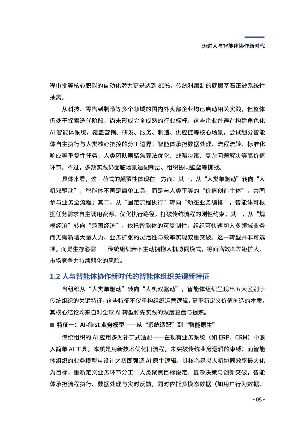 组织正站在从人类单驱动向人与智能体协作范式跃迁的历史关口。生成式AI的突破性发展,不仅在自动化重复性任务上展现出巨大潜力(一线岗位工时节约潜力高达82%),更在系统性瓦解传统科层制的底层逻辑,迫使企业重新思考价值创造的根本方式。