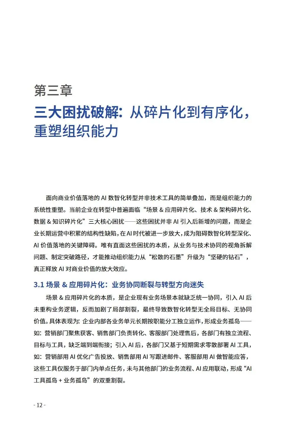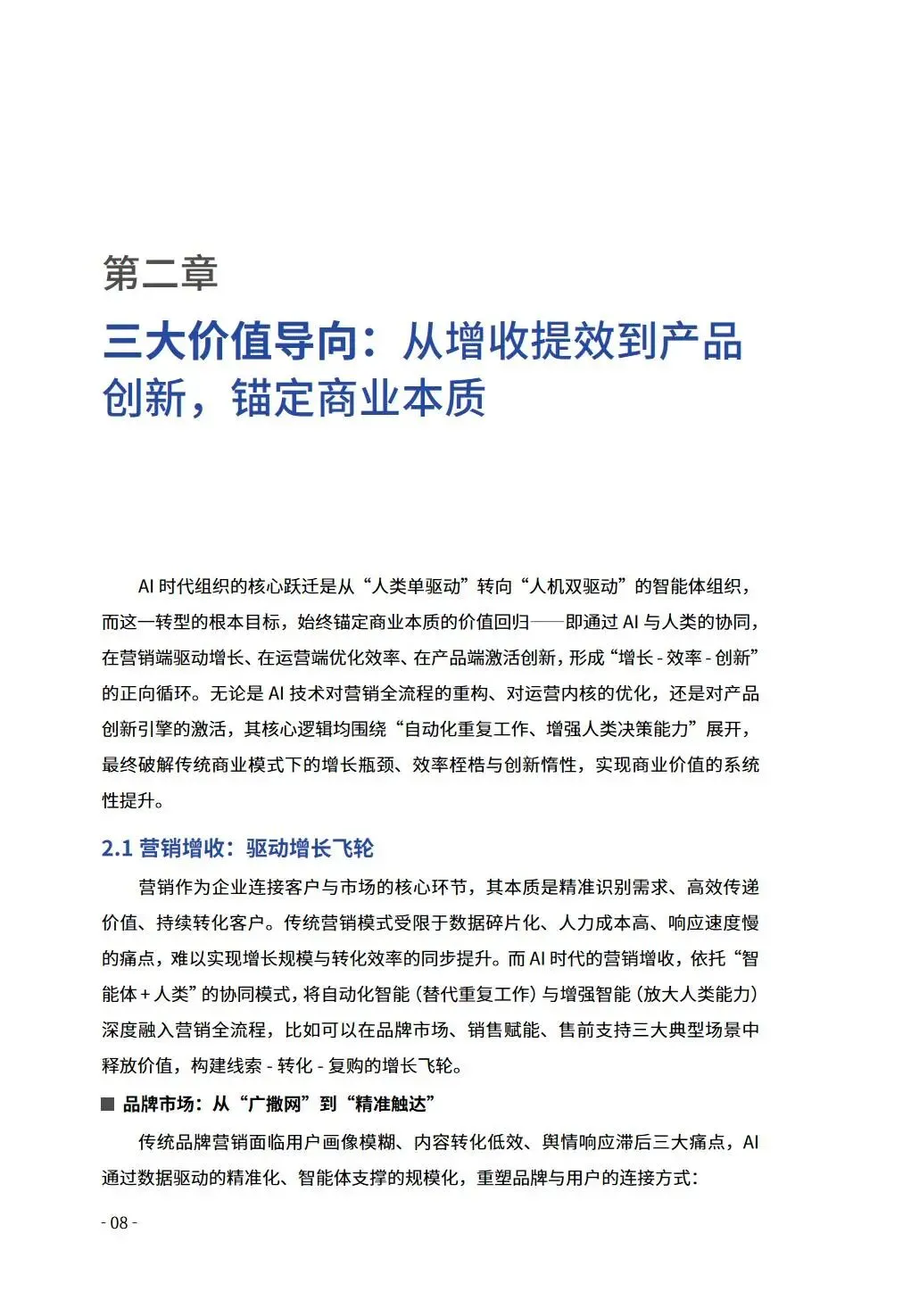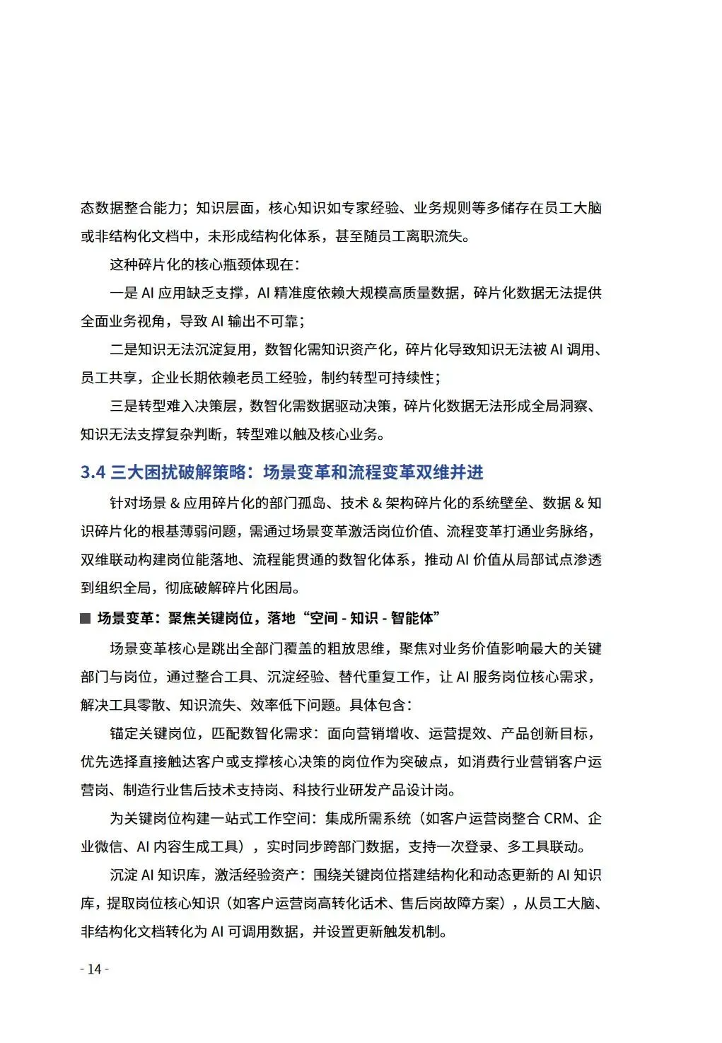 成功的转型必须超越技术工具的碎片化应用,直面并破解“场景&应用、技术&架构、数据&知识”三大结构性困局。报告提出以“营销增收、运营提效、产品创新”三大价值为导向,通过场景变革与流程变革双维并进的系统性路径。