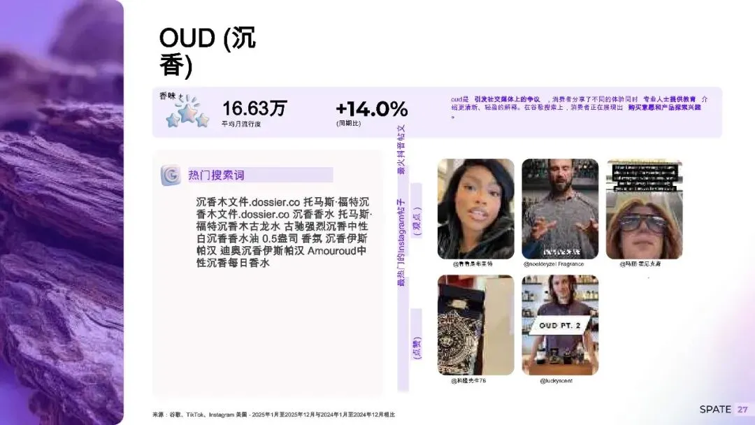 品牌格局方面,平价奢华的消费趋势,彻底打破了传统高端品牌的市场壁垒。阿拉伯香氛品牌实现了集体崛起。这些品牌以亲民的价格提供高端香气体验,精准击中了消费者对高性价比奢品香氛的需求,快速抢占用户心智。品牌相关的香氛对比内容在社交平台持续发酵,即便没有线下试香,创作者的测评与口碑,也足以支撑用户完成购买。更多小众品牌迎来爆发期,行业头部格局正在被快速重构,新品牌的崛起速度远超以往。