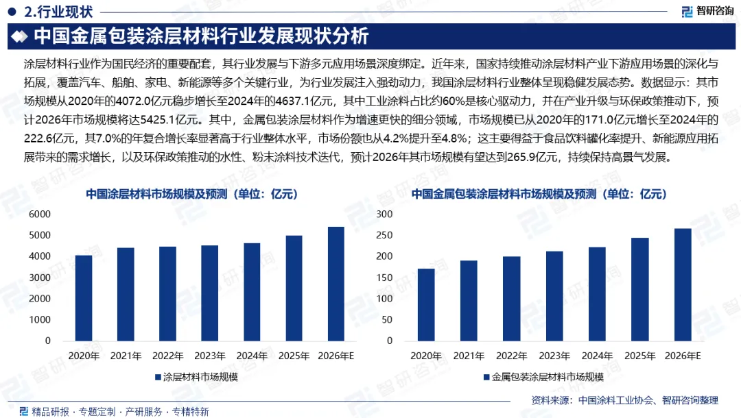 涂层材料行业作为国民经济的重要配套,其行业发展与下游多元应用场景深度绑定。近年来,国家持续推动涂层材料产业下游应用场景的深化与拓展,覆盖汽车、船舶、家电、新能源等多个关键行业,为行业发展注入强劲动力,我国涂层材料行业整体呈现稳健发展态势。数据显示:其市场规模从2020年的4072.0亿元稳步增长至2024年的4637.1亿元,其中工业涂料占比约60%是核心驱动力,并在产业升级与环保政策推动下,预计2026年市场规模将达5425.1亿元。其中,金属包装涂层材料作为增速更快的细分领域,市场规模已从2020年的171.0亿元增长至2024年的222.6亿元,其7.0%的年复合增长率显著高于行业整体水平,市场份额也从4.2%提升至4.8%;这主要得益于食品饮料罐化率提升、新能源应用拓展带来的需求增长,以及环保政策推动的水性、粉末涂料技术迭代,预计2026年其市场规模有望达到265.9亿元,持续保持高景气发展。