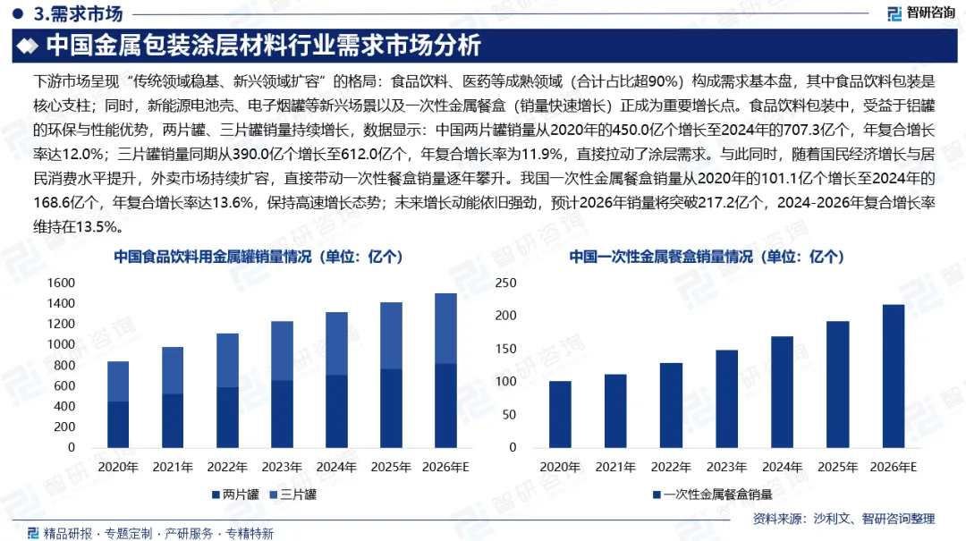 金属包装涂层材料是为金属包装表面设计的专用功能性涂覆材料,能防护金属基材、阻隔金属与内容物反应,还满足食品接触级与低VOCs等法规要求。近年来,国家对食品安全监管趋严,出台一系列标准规范与产业政策,构筑全链条监管体系,倒逼行业向高端化转型,推动高端涂层产品需求增长。下游应用市场呈现“传统领域稳基、新兴领域扩容”格局,食品饮料是核心支柱,其罐化率提升带动两片罐、三片罐销量增长,为食品级涂层材料带来稳定需求增量;一次性餐盒领域崛起成为新增长引擎。在产业升级与环保政策推动下,我国涂层材料行业整体稳健发展,金属包装涂层材料作为增速更快的细分领域,市场规模已从2020年的171.0亿元增长至2024年的222.6亿元;预计2026年其市场规模有望达到265.9亿元,持续保持高景气发展。未来,行业将深化环保化转型,推动产品功能复合化升级,加速国产替代进程,向集中化优化发展。