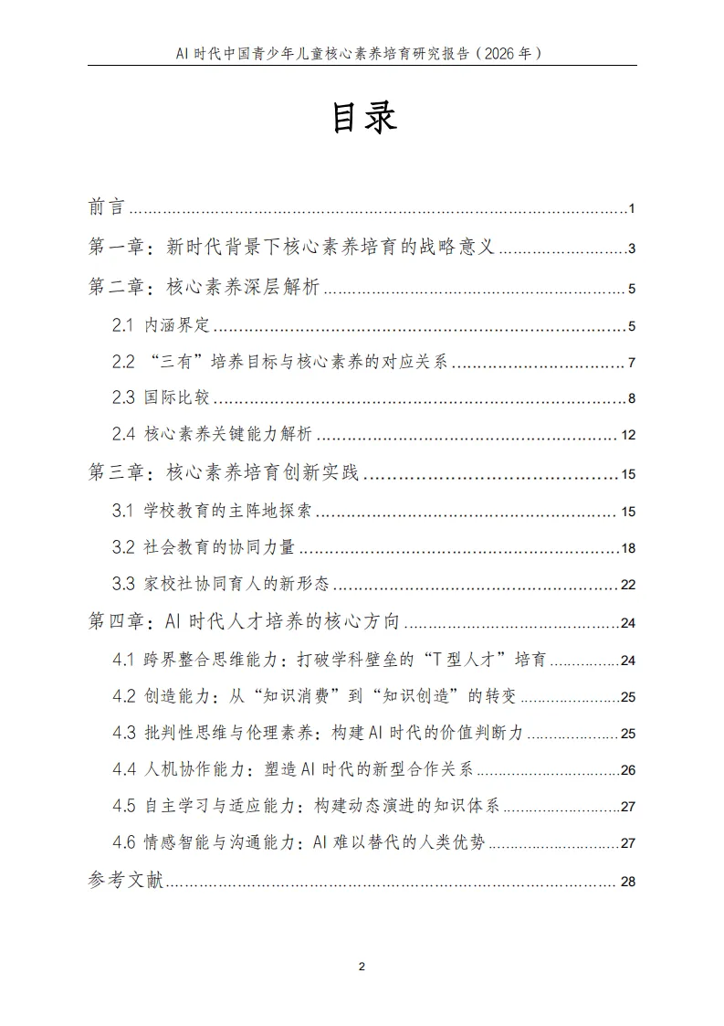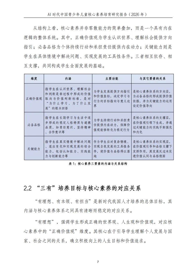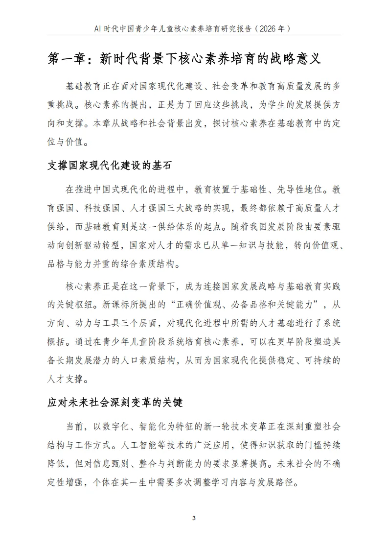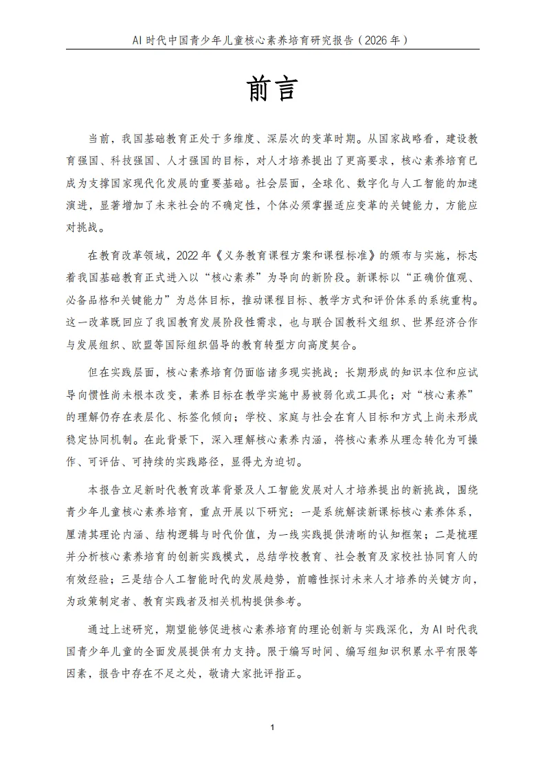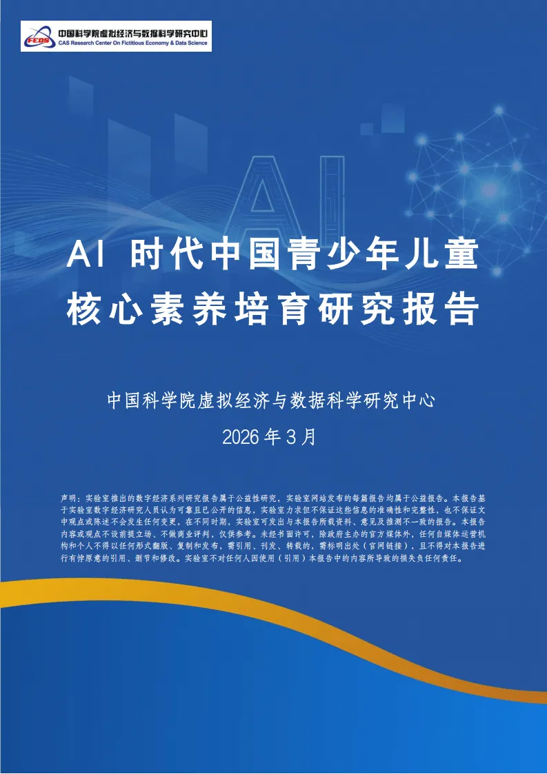 2026年3月中科院虚拟经济与数据科学研究中心发布的《AI时代中国青少年儿童核心素养培育研究报告》,立足我国基础教育改革与人工智能发展背景,围绕青少年儿童核心素养培育展开系统研究,为政策制定、教育实践提供重要参考。报告指出,我国基础教育已进入核心素养导向新阶段,但实践中仍存在知识本位惯性、素养理解表层化、家校社协同不足等问题,培育可操作、可评估的实践路径迫在眉睫。