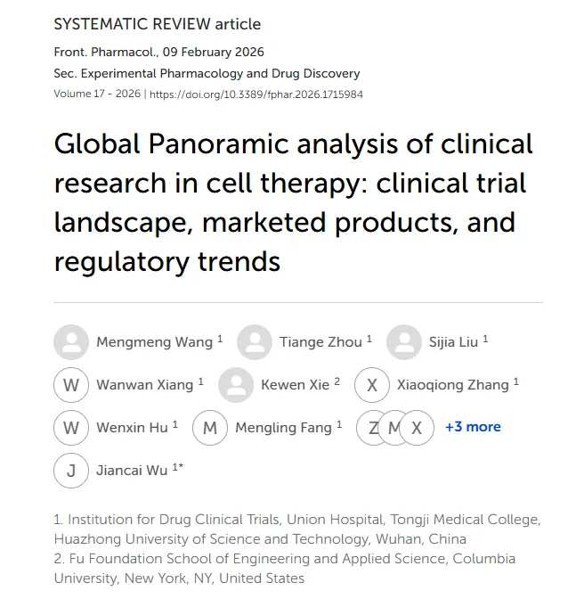 近日,华中科技大学同济医学院附属协和医院联合美国哥伦比亚大学的研究团队在国际期刊《Frontiers in Pharmacology》发布了一项全球细胞治疗临床研究的全景分析成果。