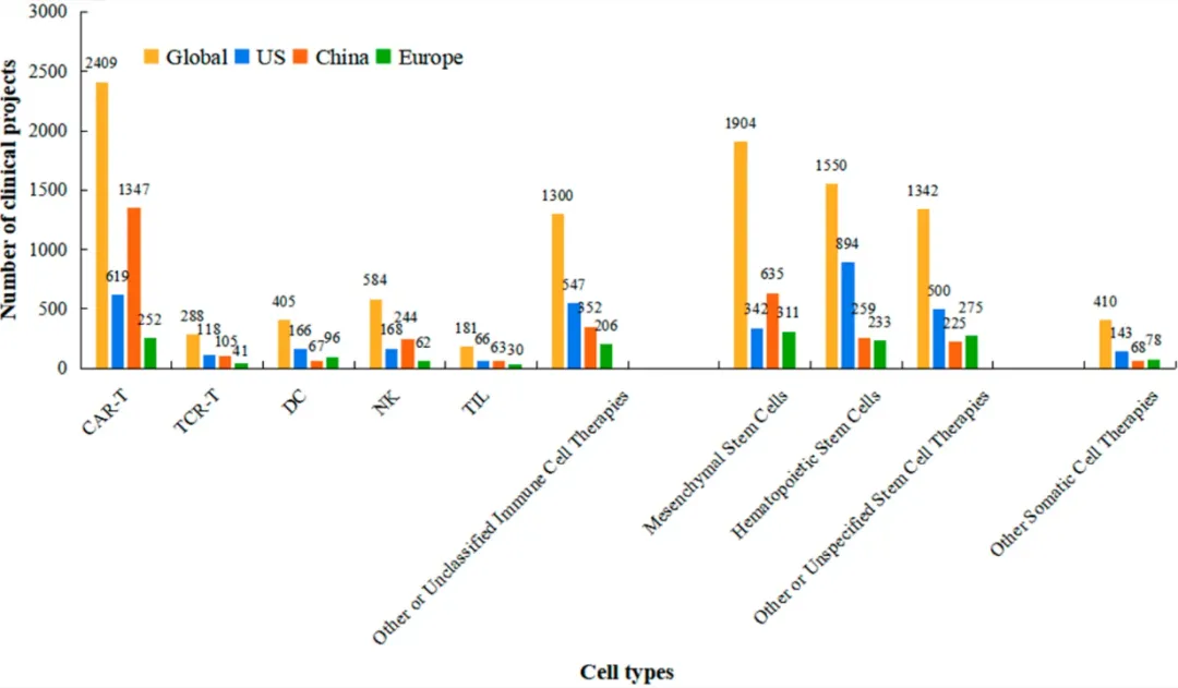 (美国、中国和欧盟不同类别细胞疗法注册临床试验的数量)