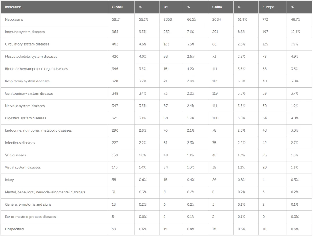 适应症方面,肿瘤治疗占据半壁江山(56.1%),免疫系统疾病(9.3%)紧随其后,而心血管、神经、代谢等多个疾病领域的探索正在不断拓展。中美两国的肿瘤研究占比更是分别达到 61.9% 和 66.5%,远超全球平均水平。